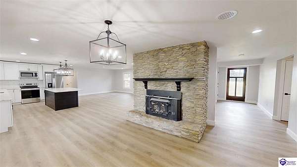 Look no further..Space, Privacy, and COMPLETELY REMODELED!!!! Over 3400 sq ft ALL on one level. Privately situated on the close to 3 acre lot. The brand new kitchen serves up an oversized island, granite countertops, pantry, and subway tile backsplash. Steps away from the kitchen you will find the dining area featuring a stone wood burning stove. Two Separate massive family/living rooms. The stunning master bathroom offers a free standing oversized tub, double vanity, and absolutely gorgeous tiled step in shower. Crown molding in all bedrooms. Beat the heat or rain and enjoy the private country setting from your large covered patio whether its starting your day in tranquility or winding down in the evenings. An additional garage/pole barn is available off of the massive concrete drive. The sprawling acreage gives you privacy as you enjoy the wide open space with the scattering of mature trees throughout the lot. Gladiator flooring custom installed in the grage. Schedule your tour today this one wont last long. Seller can convert the second family room to a 4th bedroom if desired.
