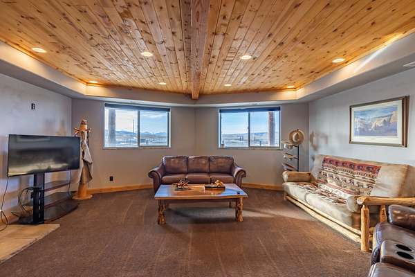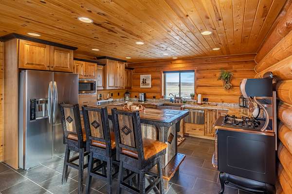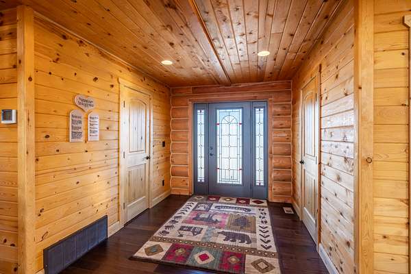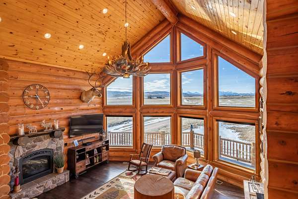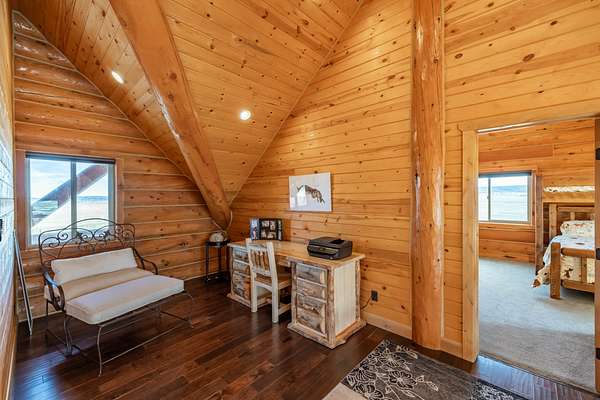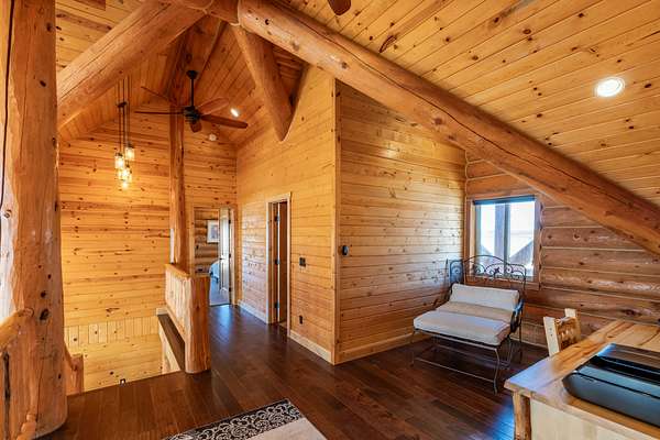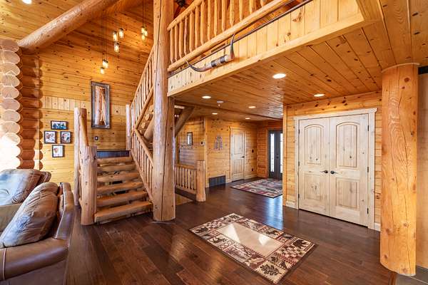 Step inside and feel instantly at home beneath soaring vaulted ceilings, where rich natural wood tones and massive hand-crafted log beams rise with quiet strength and timeless beauty. Every log, every joint, every detail tells a story of pride, precision, and care. Sunlight pours through a dramatic wall of windows, illuminating the warmth of the wood floors and creating a space that feels both grand and deeply inviting. The great room is the soul of the home--perfect for gathering with loved ones, sharing stories by the fire, or enjoying peaceful evenings wrapped in stillness.