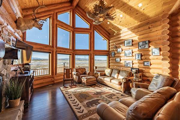 A truly rare custom 3,500+- sq ft log home where craftsmanship meets nature. Built in 2015 and kept in immaculate condition, this 3-bedroom, 3.5-bath retreat features soaring vaulted ceilings, hand-crafted logs, a stunning stone fireplace, and walls of windows framing breathtaking Uinta Mountain views. Surrounded by two peaceful ponds and a stream access, with expansive decks and a 40' x 60' shop for all your toys and tools.