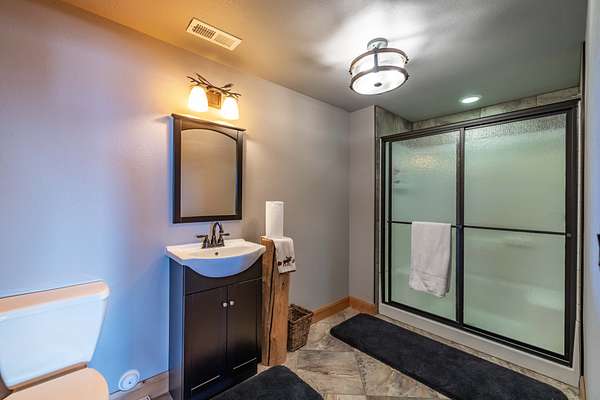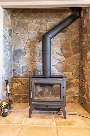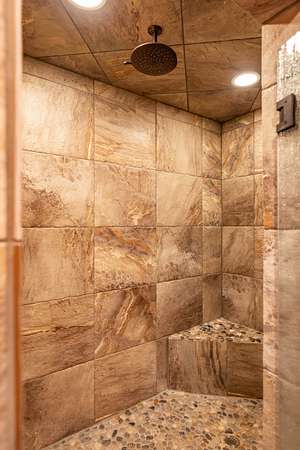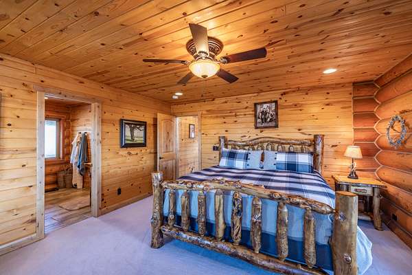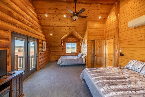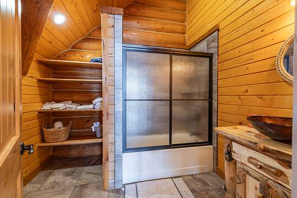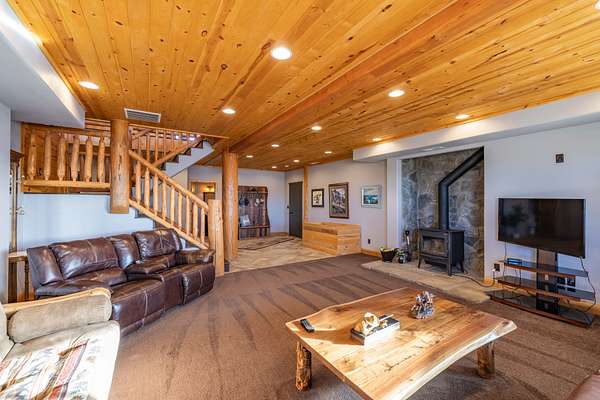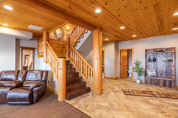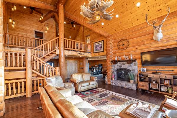 A stunning stone fireplace anchors the living space, while the thoughtfully designed open loft and handcrafted log staircase overlook the room below, adding architectural character and a sense of connection throughout the home. The layout offers openness without losing intimacy--spaces flow naturally, yet each feels purposeful and personal.
