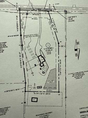 This is a fixer upper on a 3.15 acre lot. Pool has been winterized and covered. Existing septic field lines are on the west side of the house. See the new plat that will be recorded at closing (shows the secondary soil field). House is in decent condition and needs updating.