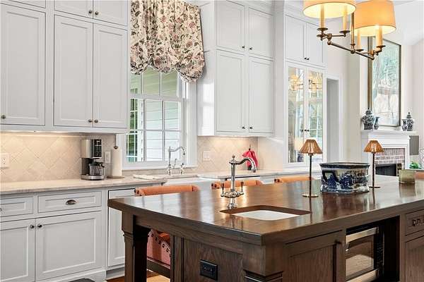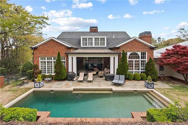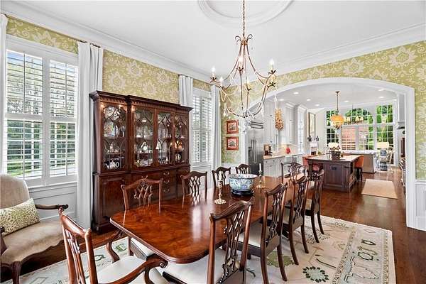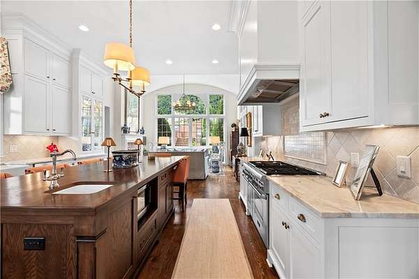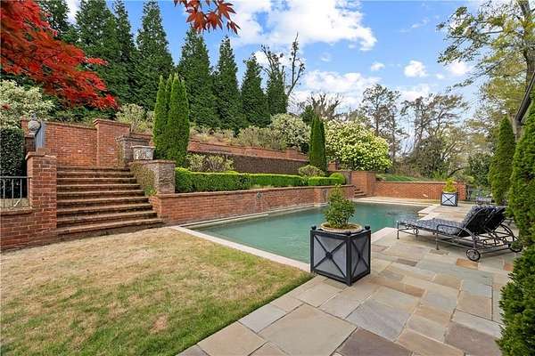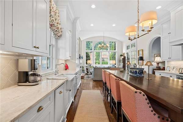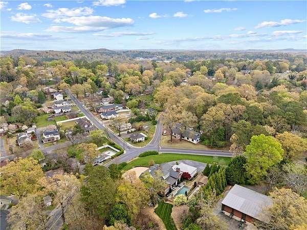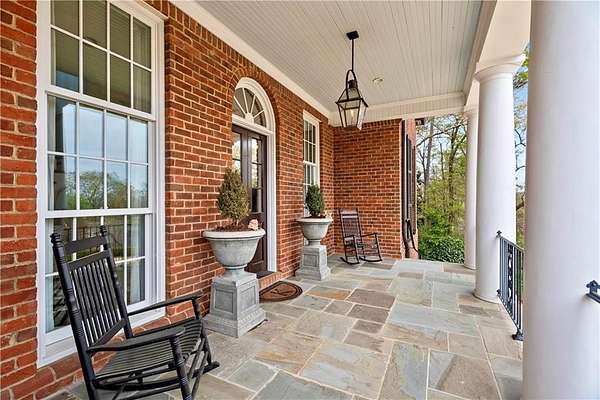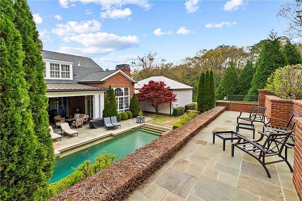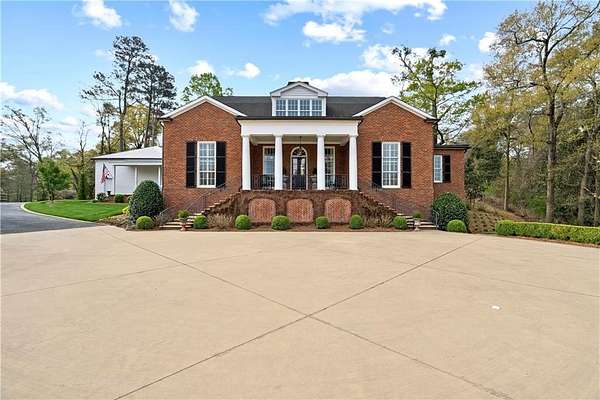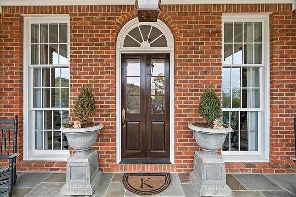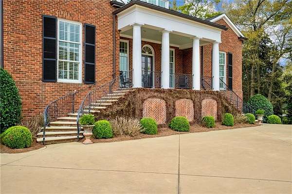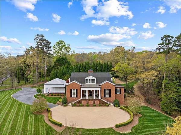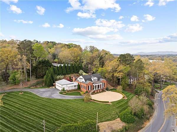 Perched above the Heart of Downtown Calhoun and set on approximately two private acres, this exceptional and extraordinary four-sided brick residence offers a rare combination of privacy, elevation, and scenic views of the town and distant mountains. Approached by a gently curving driveway, the home sits prominently overlooking mature landscaping, lush hydrangeas, and one of the most beautiful lawns in the area. Despite its central location, the setting feels remarkably quiet and secluded. Thoughtfully designed with meticulous attention to detail, the home showcases high-end finishes throughout. From the exotic wood on the side porch to limestone steps and bluestone on the front porch, quality craftsmanship is evident at every turn. Wood columns, shutters, and doors complement the timeless architecture, while triple-hung floor-to-ceiling windows along the front of the home fill the interiors with natural light. The ceilings on the main level range from approximately 11 to 14 feet and are enhanced by extensive molding and trim work. Flooring consists of rich hardwoods and natural stone, reinforcing the home's classic, upscale aesthetic. The foyer features an antique newel post, and designer lighting throughout. The main level offers beautifully proportioned living spaces including a welcoming family room, keeping room, and well-appointed kitchen designed for both everyday living and entertaining. The primary suite and an additional bedroom or office are conveniently located on the main level. Upstairs, two spacious bedrooms are connected by a bright sitting area with expansive windows and beautiful natural light. Each bedroom in the home features an en-suite bath, along with large closets complete with custom wooden organization systems and drawers. The finished terrace level provides exceptional flexibility with a full kitchen, living area, game space, craft room, full bath, and an additional room that can serve as a fifth bedroom. Built into the side of a rock hillside, this level offers added safety and can function as a storm shelter. The home also provides abundant storage throughout. Outdoor living is equally impressive with a low-maintenance heated gunite pool, irrigation system, and mature landscaping designed for both beauty and ease of care. The terrace and covered porch create multiple areas for relaxing or entertaining while enjoying the peaceful surroundings. Additional highlights include a three-car garage, extensive storage, en-suite bedrooms throughout, and a thoughtfully designed layout combining elegance with functionality. With its elevated setting, exceptional finishes, and private yet convenient location, this remarkable property offers a rare opportunity in the heart of Calhoun.