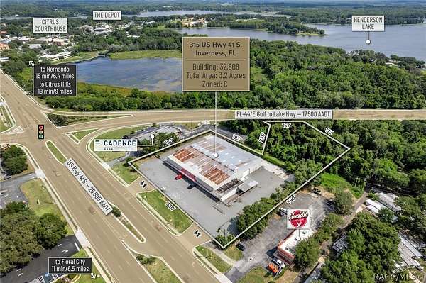 This is a rare opportunity to secure one of the last remaining large parcels in the main commercial corridor. Situated just off the controlled intersection of US Hwy 41/W Main Street interchange (25,500 AADT) and SR 44/E Gulf to Lake Hwy (17,500 AADT), the property spans 3.09 acres with over 330 feet of highway frontage and a combined traffic area of over 71,500 cars daily in the City Limits of Inverness with City Water and Sewer. Zoned C-Commercial allows the highest density of development for commercial enterprise in Citrus County Land Development Code. The subject property is easily accessible, with full ingress and egress via a median curb cut from southbound traffic and right-in access for northbound traffic. It is located at the nexus of W Main Street, US Hwy 41, and SR 44, which connects to I-75 within 15 miles to the east. Current improvements on the subject property include a mixed-use retail and warehouse facility with over 32,608 square feet, 3-phase electric, and 25-foot ceilings in the warehouse area. It also features two 20'x20' grade-level doors and full pull-through access for large box trucks and other commercial vehicles. Additionally, approximately 1.9 acres of the site serve as a fenced laydown storage yard. Disclaimer: All information provided herein is for marketing purposes only and is not guaranteed for accuracy. Prospective buyers or tenants are encouraged to conduct their own independent due diligence. The seller, broker, and associated parties make no representations or warranties, expressed or implied, as to the accuracy or completeness of this information. All dimensions, zoning details, financial data, and other property-related facts should be independently verified. Please consult with appropriate licensed professionals before making any investment or purchasing decisions.