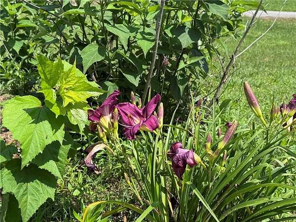 One of the defining features of the property is the covered wrap-around porch, which runs along multiple sides of the home. Offering a comfortable place to sit, relax, or host guests, this outdoor space creates a connection to the surrounding land and enhances the home's livability. The property is bordered by mature trees and dotted with flowering species and perennial blooms, giving color and character throughout the year.