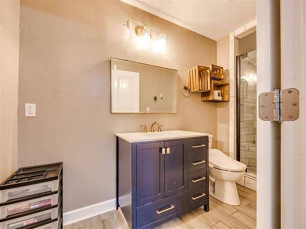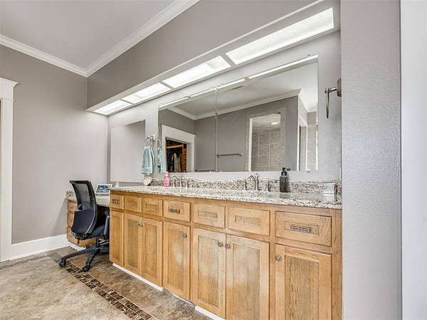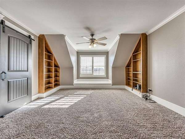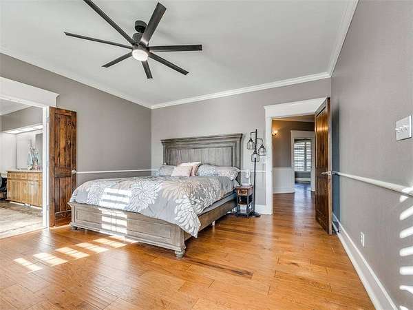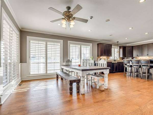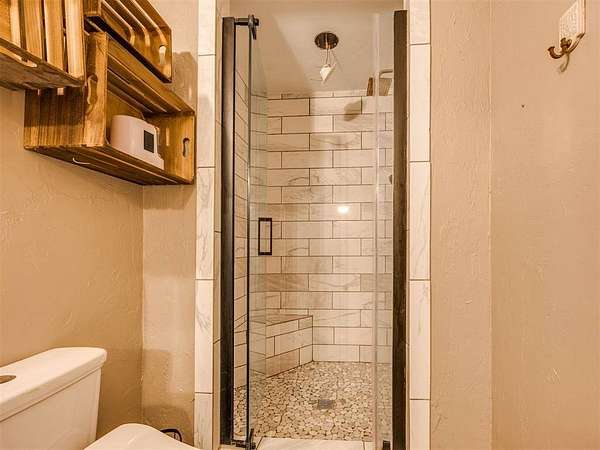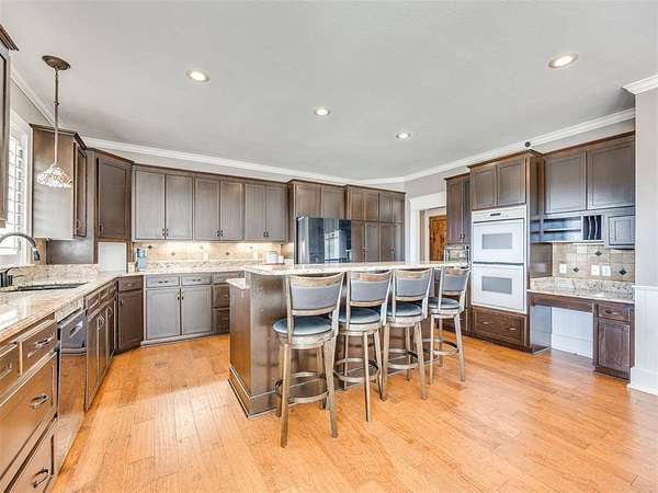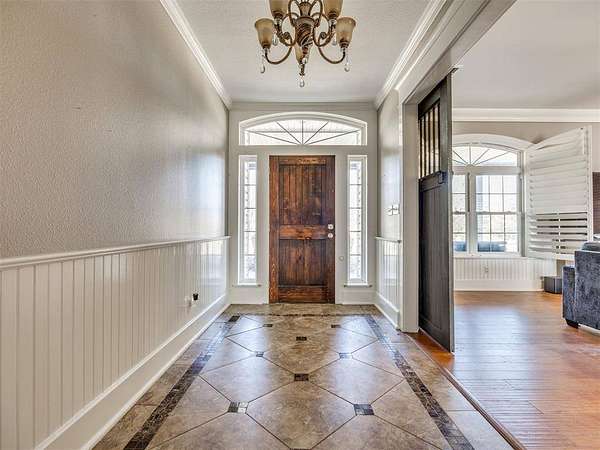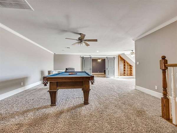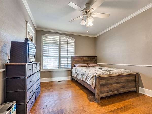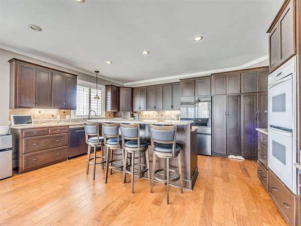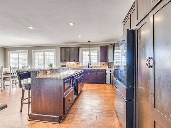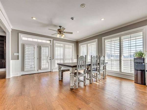 Custom-built country estate on 30 fenced acres with 3 ponds, creek, and mix of cleared and wooded acreage. The 4,553 sq ft main home offers large rooms, engineered hardwoods, plantation shutters, crown molding, custom built-ins, and a cozy wood-burning fireplace. Two primary suites (one up, one down) provide ideal flexibility. The main living areas showcase engineered hardwood floors, beautiful kitchen with under cabinet lighting and granite, (will have new double oven installed), and an open, airy eat in dining space that flows seamlessly into the living room-creating ideal gathering space. The living area features custom built-ins, a cozy wood burning fireplace, and elegant crown molding, while barn doors add character and function at the entry. Plantation shutters highlight the home. The downstairs primary suite offers private access to back covered patio, a huge walk in closet, jetted tub, and walk in shower with dual shower heads. Upstairs offers a private bedroom with full bath, walk in closet, a half bath off of spacious bonus room, and a separate living space currently set up as home theatre. The property also features an attached 2,400 sq ft shop with 3-phase electric, skylights, office space, bath, custom cabinetry, RV hookup, and three tall insulated overhead doors. Office space (or extra storage room) in process of being redone, fresh drywall, LED lights, and new attic door. Connected guest quarters include two bedrooms, living area, kitchen, and bath--perfect for multigenerational living , income potential, or home business. Beautiful mix of cleared and wooded acreage with 3 ponds, and stream, perfect for enjoying the outdoors, livestock, or recreational use. Under ground storm shelter outside for peace of mind during storm season. Just 5 minutes from Shawnee Twin Lakes and located in the highly desired Dale Schools. A rare opportunity offering luxury, functionality, and space to live, work, and play.