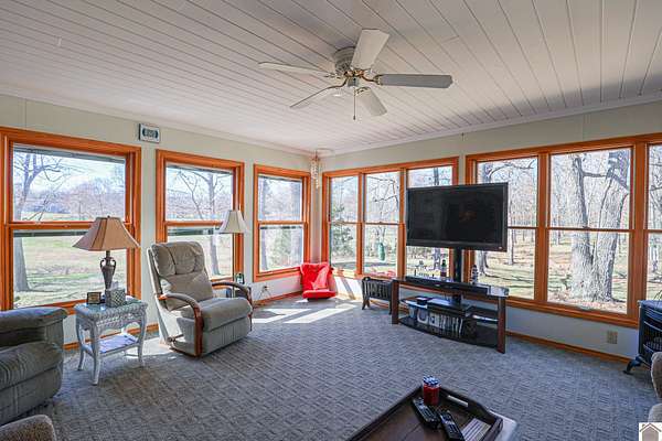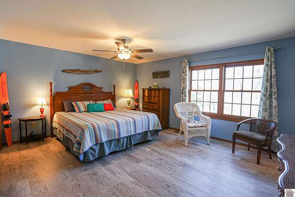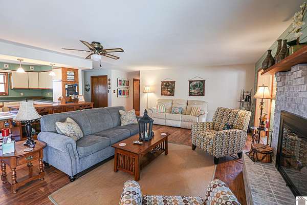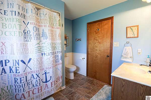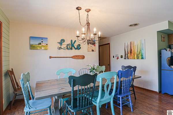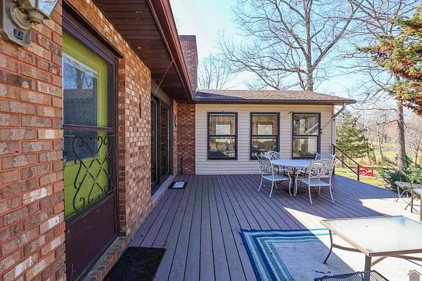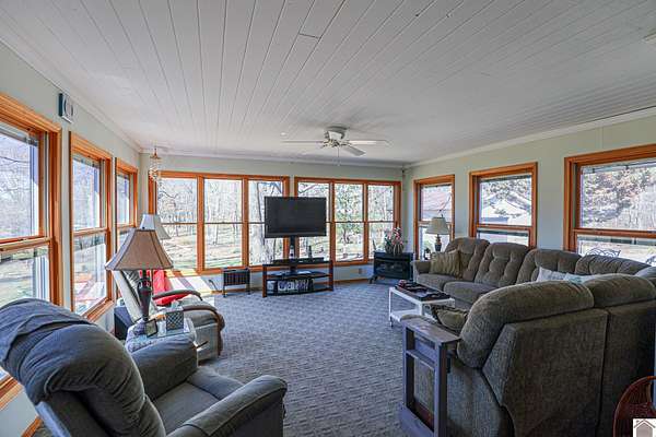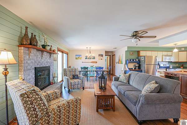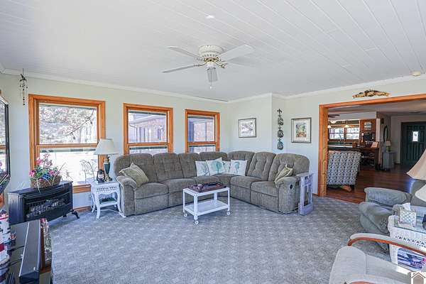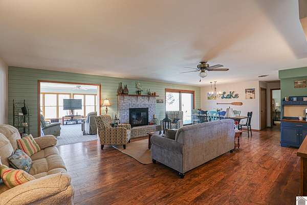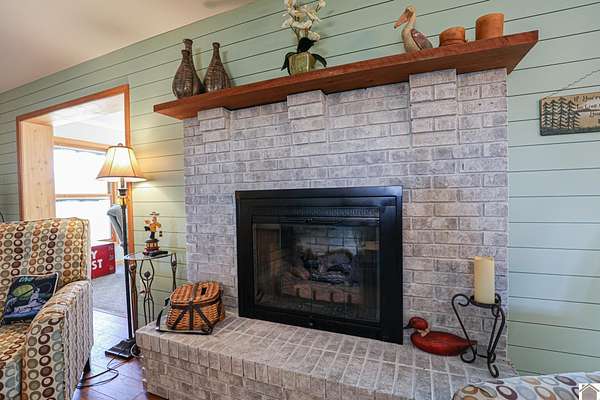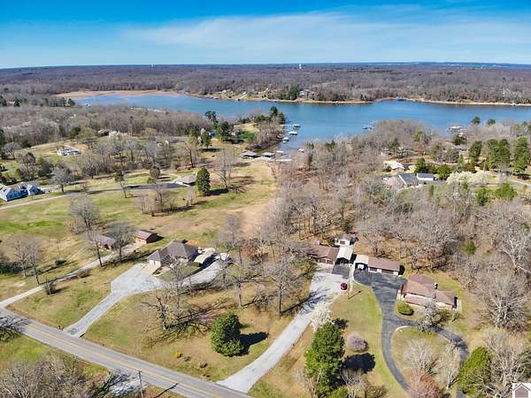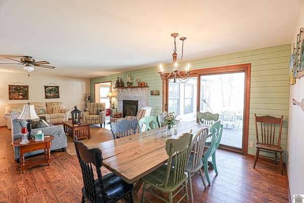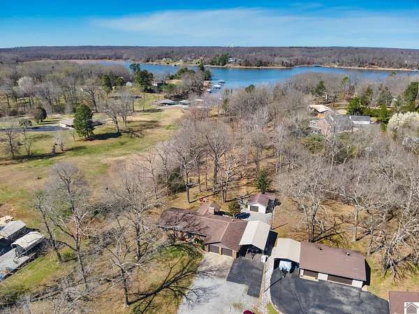 Enjoy the lake lifestyle with the privacy of a wooded setting in this 3 bedroom, 3 bathroom waterfront home situated on 1.56 acres. The property features an attached 2 car garage, detached 1 car garage/shop, and a carport ideal for boat storage. A gentle slope down to the water and shared dock. Inside, the living room offers a cozy fireplace, while the kitchen provides bar seating and ample storage. A beautiful sunroom captures serene views, creating the perfect place to relax. With a split floorplan, the primary suite offers privacy, a generous closet space, and an ensuite bathroom. Two additional bedrooms are located on the opposite side of the home, including one with its own modern ensuite. This property offers the perfect blend of lake living and peaceful surroundings. Property is turnkey; furniture is included!