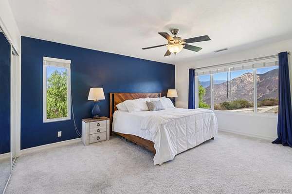 Stunning Hilltop Retreat with Panoramic Mountain Views! Perched atop 4.82 acres, this impressive two-story home captures breathtaking views of the Palomar Mountains from nearly every room. Featuring 5 bedrooms and 3 baths, the spacious open floor plan is filled with natural light and designed for comfortable living and entertaining. The beautifully remodeled kitchen opens to the inviting family room with a cozy fireplace, creating the perfect gathering space. Enjoy true energy independence with owned solar and four Tesla Powerwalls, providing seamless backup power the instant the grid goes down-quietly and cleanly keeping your home, lighting, refrigeration, and Wi-Fi running during SDG&E shutoffs. A whole-house generator plug adds an extra layer of security for extended outages. Modern upgrades include dual-paned windows, stylishly renovated bathrooms, and fresh finishes throughout. Step outside and take in sweeping 360 degrees views while enjoying an 18-foot swim spa that doubles as a heated hot tub and endless pool, complete with color-changing lights-perfect for relaxing or fitness under the stars. The expansive outdoor space also features a golf putting green, a fenced play area for kids or dogs, a swing set, and thoughtfully planted, maturing fruit trees with water-conscious, app-controlled irrigation. You'll also enjoy high-speed AT&T Fiber Optic internet or Starlink, reliable delivery from Amazon, Uber Eats, and Ralphs, plus nearby restaurants and the locally loved Lilac Foods grocery.