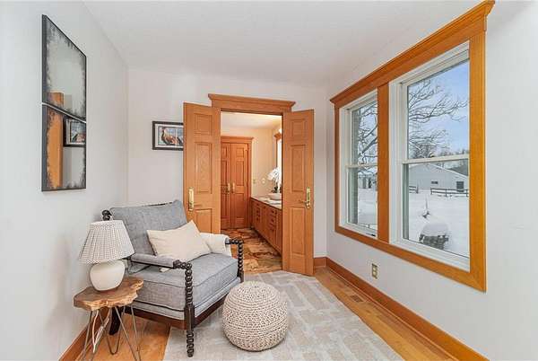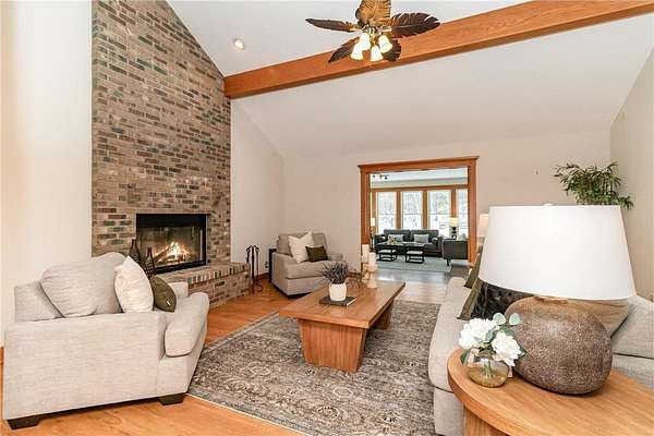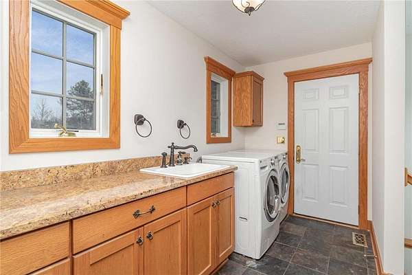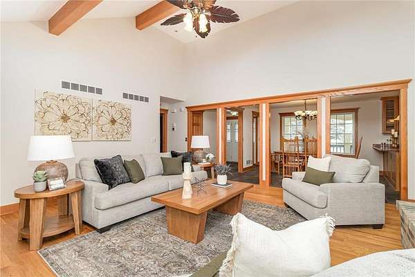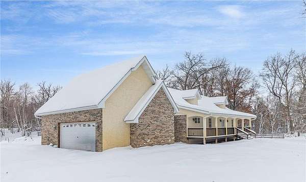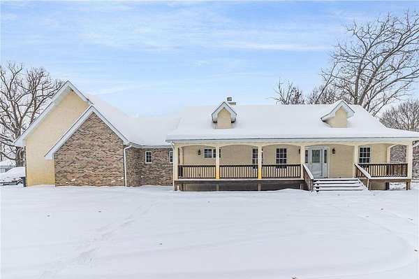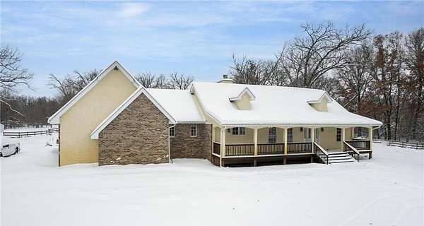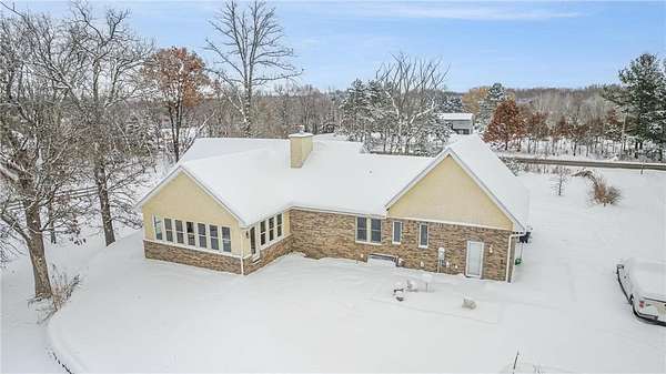 This one-owner rambler sits on 24 beautiful acres, offering a rare blend of privacy, functionality, and usable land. Inside, the home features 3 bedrooms and 2 bathrooms across a thoughtful main-level layout. The inviting living room boasts a vaulted ceiling with exposed beams, oak hardwood floors, and a cozy two-sided fireplace shared with the primary bedroom. The kitchen and dining room showcase slate tile floors, oak cabinets, and granite countertops, creating a warm and timeless aesthetic. French doors lead to a charming 4-season porch/sun room. The sun room, basement and attached garage feature in-floor heating. The spacious primary bedroom includes built-in storage and a private ensuite. A large covered front porch provides a welcoming entry and the perfect spot to take in sunsets and surrounding views. The lower level is unfinished with opportunity to make it fit your needs. For those seeking storage, workspace, or land-based hobbies, this property offers an exceptional outbuilding package: a 36x26 detached garage, a 48x48 pole barn, and a 12x10 storage shed. With acreage suitable for agricultural use, a beautiful setting, and a well-cared-for home filled with character, this property delivers the ideal combination of comfort, land, and opportunity.