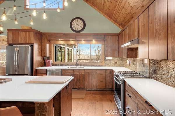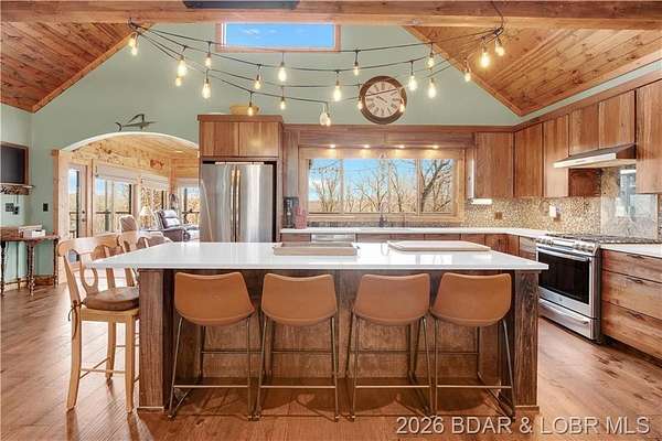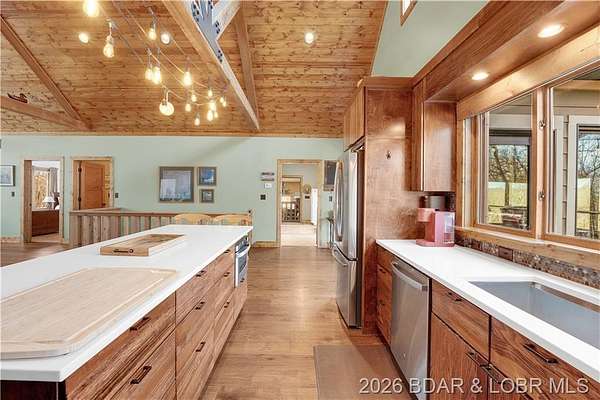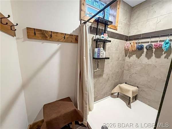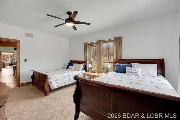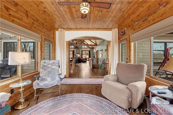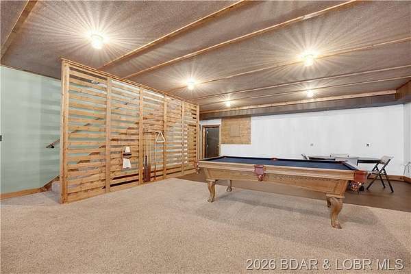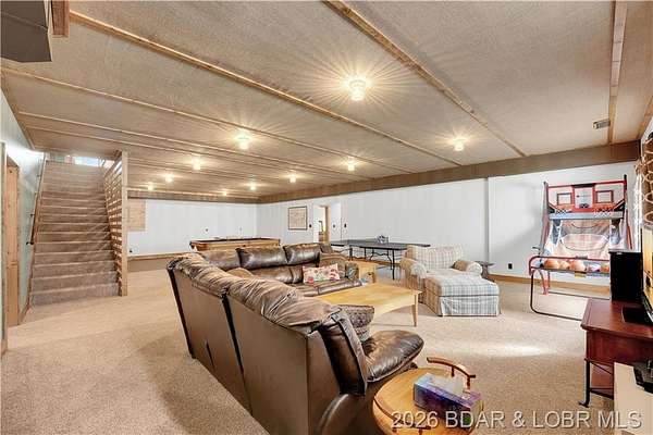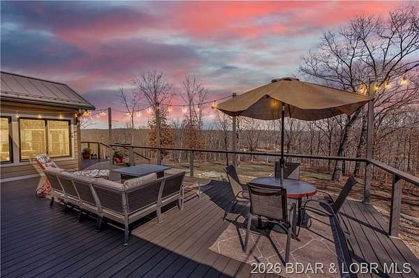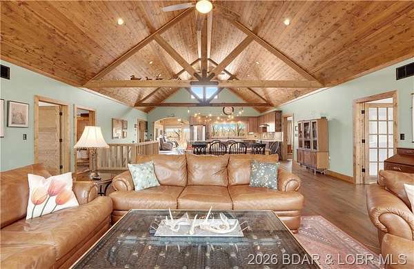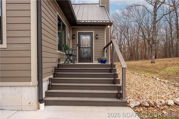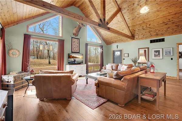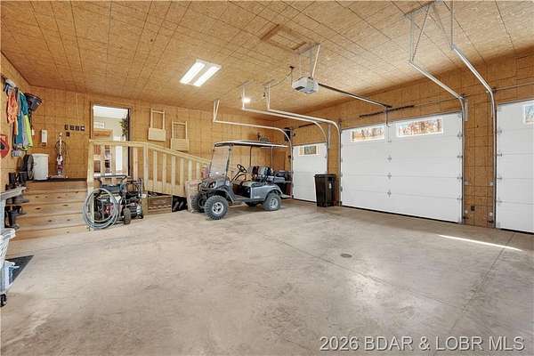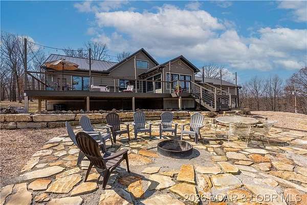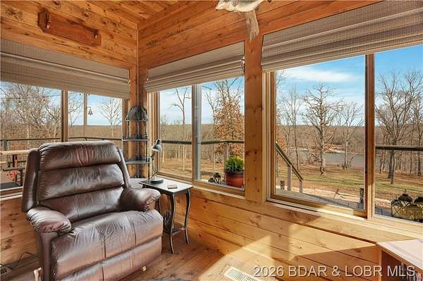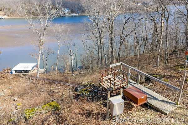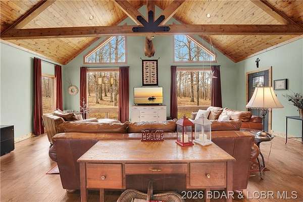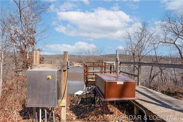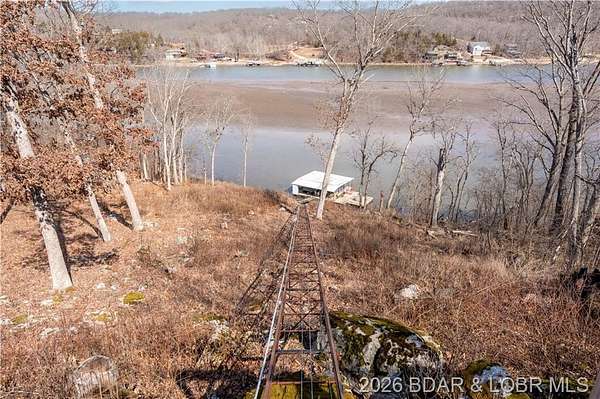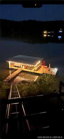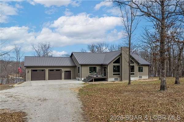 Custom-built waterfront home on approximately 5 acres +/- at the 75 mile marker of Lake of the Ozarks offering 4 bedrooms and 3.5 bathrooms. Two bathrooms feature large walk-in tile showers with bench seating and one includes a shower/tub combination. The open living, dining, and kitchen area features wood flooring, vaulted wood ceilings with exposed beams, and large windows providing natural light and views of the surrounding landscape. The kitchen includes a 9-ft island with seating, quartz countertops, custom cabinetry, stainless steel appliances, and a walk-in pantry. Main level also includes an office, sunroom, laundry room, mud room, and attached 2.5-car garage. Lower level offers a game room with pool table included, two bedrooms, and a full bath. Approx. 110ft of waterfront with electric tram to a private two-slip dock with lifts and swim platform. Located in Forbes Lake of the Ozarks Park.
