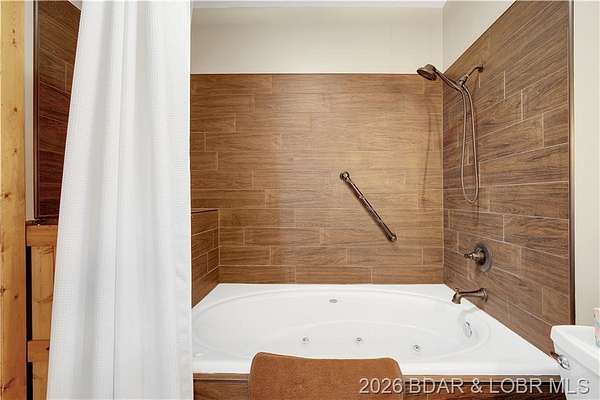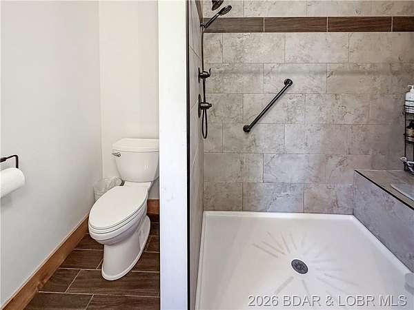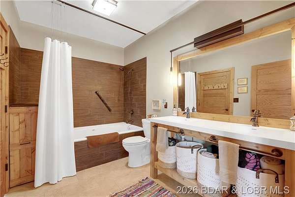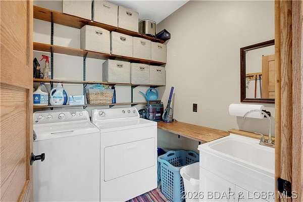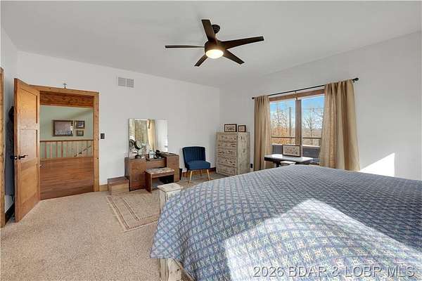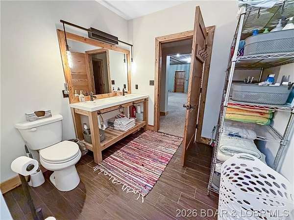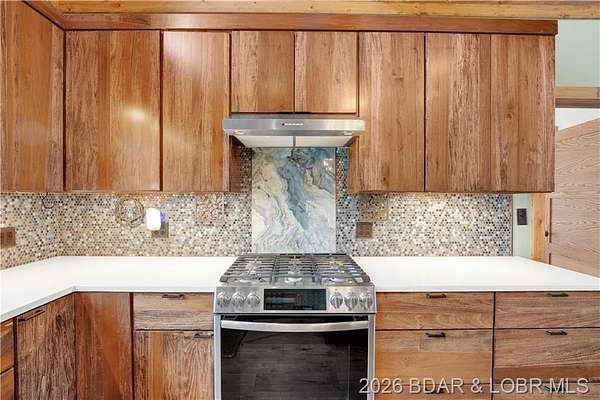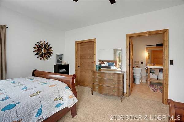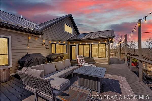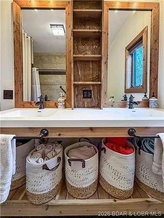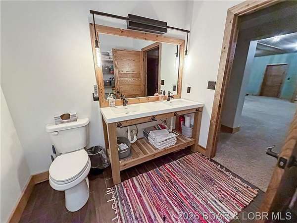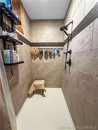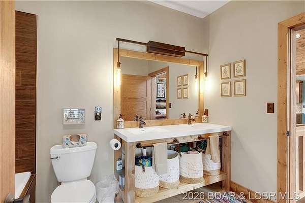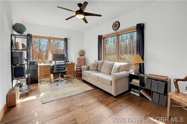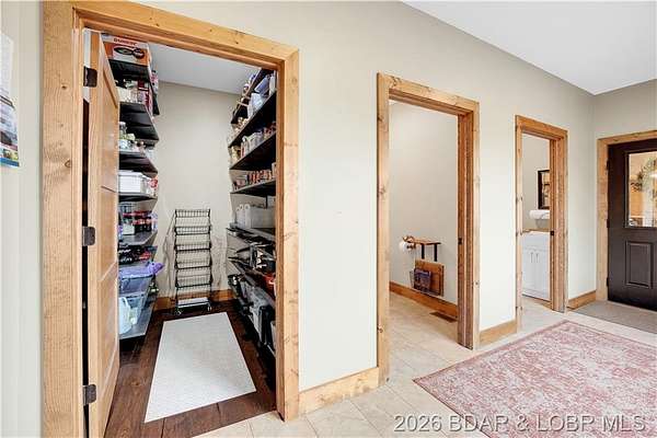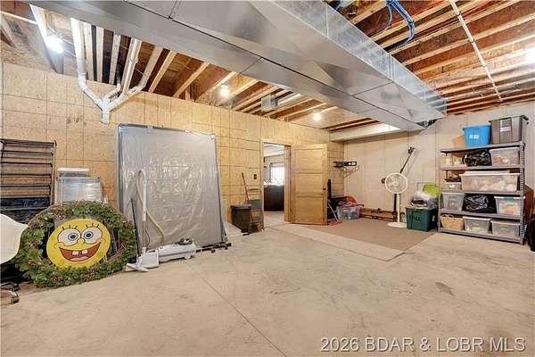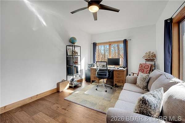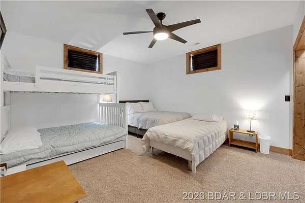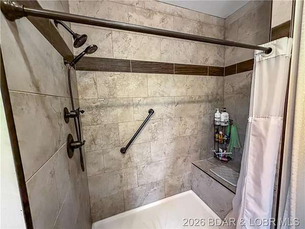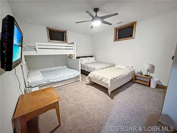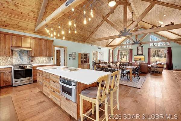 Custom-built waterfront home on approximately 5 acres +/- at the 75 mile marker of Lake of the Ozarks offering 4 bedrooms and 3.5 bathrooms. Two bathrooms feature large walk-in tile showers with bench seating and one includes a shower/tub combination. The open living, dining, and kitchen area features wood flooring, vaulted wood ceilings with exposed beams, and large windows providing natural light and views of the surrounding landscape. The kitchen includes a 9-ft island with seating, quartz countertops, custom cabinetry, stainless steel appliances, and a walk-in pantry. Main level also includes an office, sunroom, laundry room, mud room, and attached 2.5-car garage. Lower level offers a game room with pool table included, two bedrooms, and a full bath. Approx. 110ft of waterfront with electric tram to a private two-slip dock with lifts and swim platform. Located in Forbes Lake of the Ozarks Park.