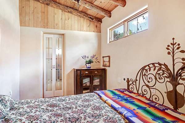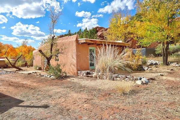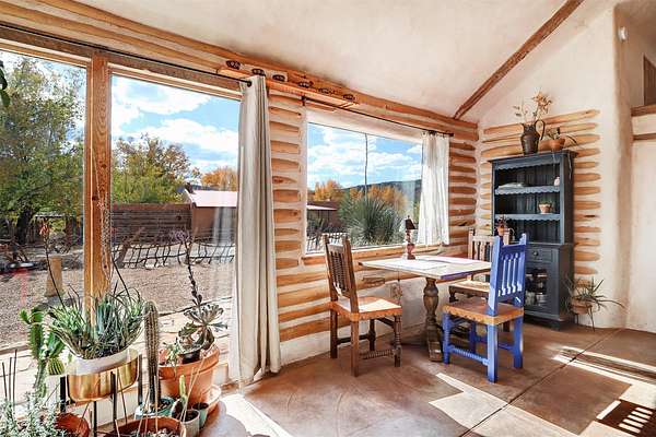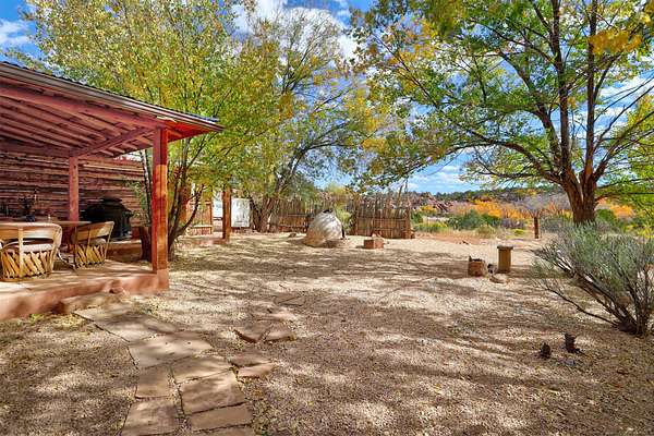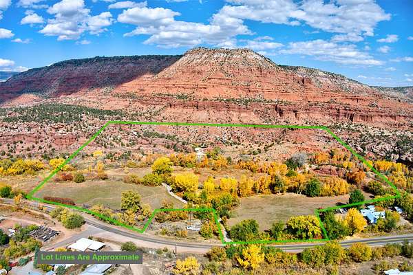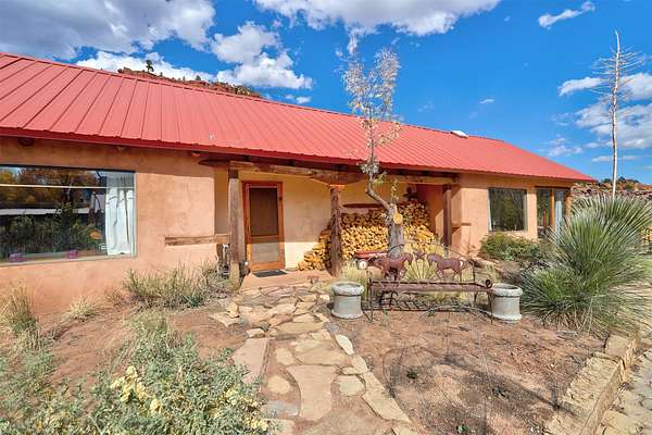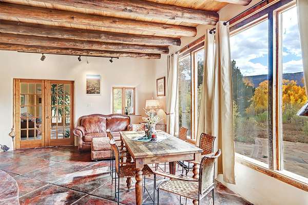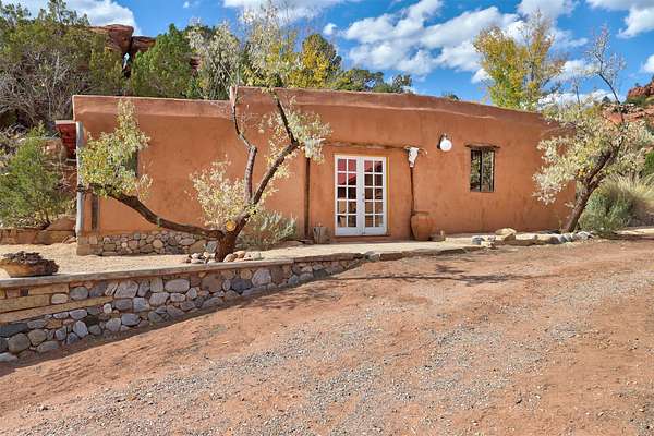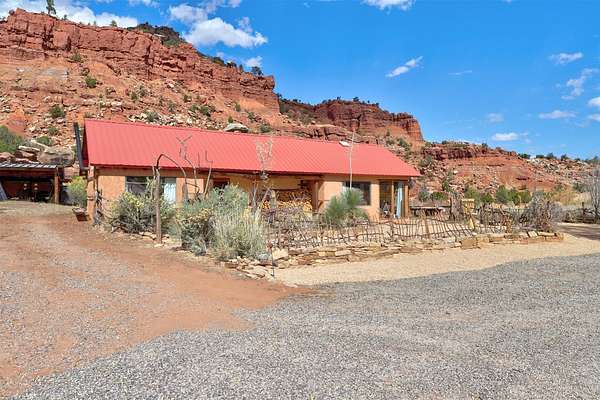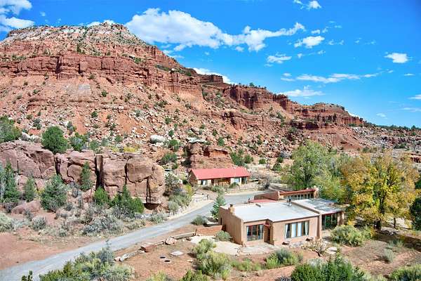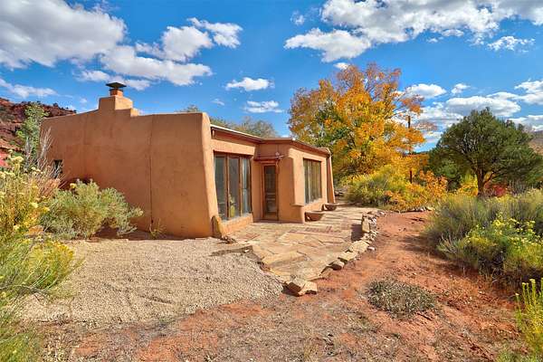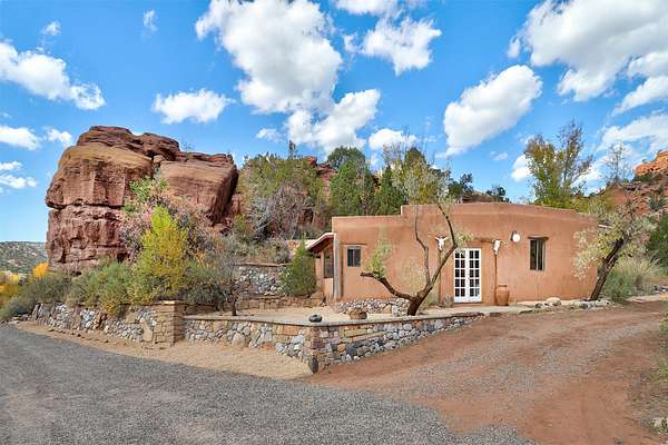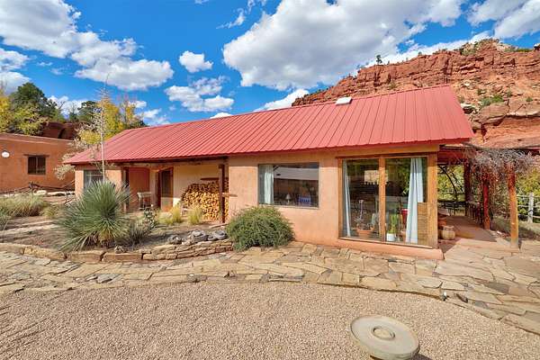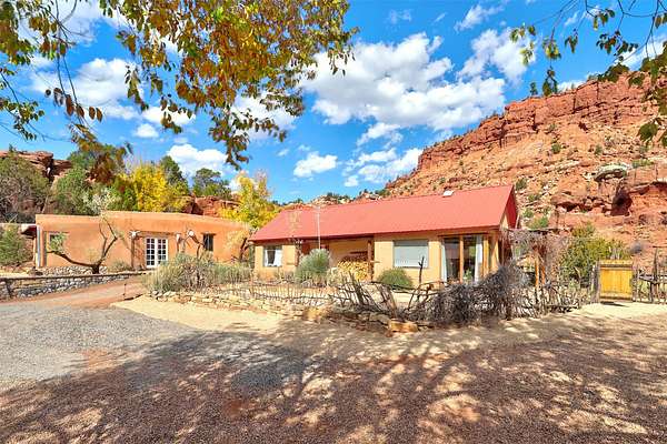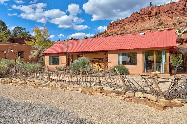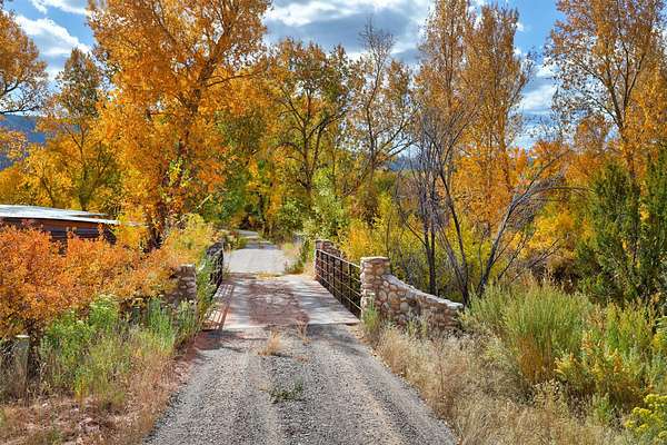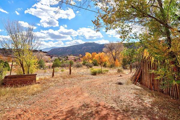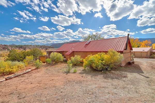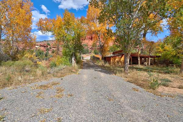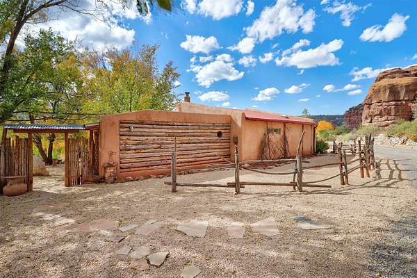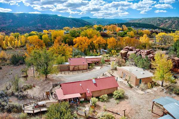 Situated west of Abiquiu Lake in Arroyo del Agua, this 37-acre property offers some of the most stunning views in the Abiquiu area, featuring lush, pastoral fields and dramatic rock outcroppings. The main house, originally built in the early 1900s and updated in 1994, includes passive solar design, vigas and rough-sawn beams, hand-crafted doors and cabinetry, and covered porches in both the front and rear. Inside, the main house also boasts a sunroom, one bedroom with an ensuite bathroom, and an office with a separate bathroom. At the heart of the home is a versatile room with adobe walls finished in a patina of the years past, perfect for a gallery, media room, or an old-style cantina just waiting for a pool table. The charming casita, with its exterior blend of logs and stucco, seamlessly integrates into the landscape. Inside, you'll find a bright kitchen and dining area, a cozy sleeping loft, and a comfortable living space. The studio is well-equipped with two spacious rooms, laundry facilities, and a bathroom. Irrigation rights support over 14 acres of hay production or other farming activities, with ample space for additional fruit trees along the bosque area. The property also includes a barn with a tack room, hay storage, and covered areas for animals or equipment, along with nearby corrals. Just a few minutes on this property and you immediately find yourself lost exploring along the creek and through the fields, or amazed at the rock outcroppings above the buildings until you finally take a moment to soak in the views of the surrounding Jemez Mountains to the south and the iconic Pedernal to the east. Few properties become available that offer the lush greenery and wildness that this one does. Additional photos and information available upon request.