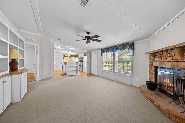 - Blinds, Book Case(s), Ceiling Fans, Eat-In Kitchen, Electric Dryer, Electric Range, Fireplace, Front Load Washer, Kitchen Island, Kitchen/Dining Combo, Laundry/Utility Room, Living Room, Open Floor Plan, Smoke Detector, Walk-In Closet(s), w/ Hookups