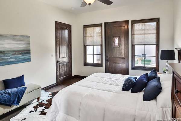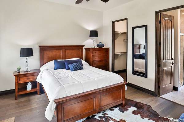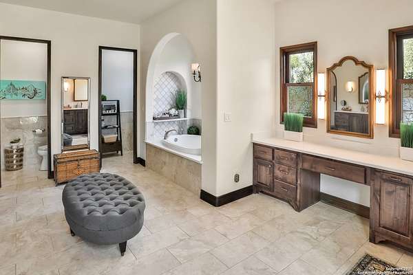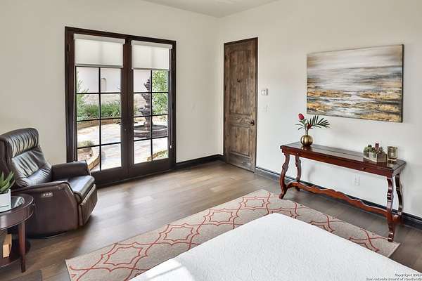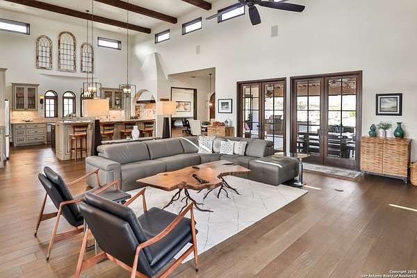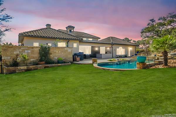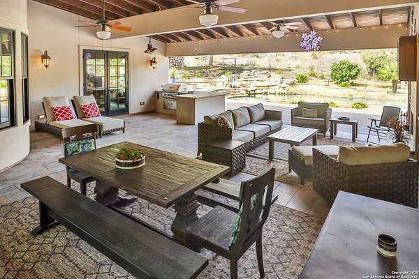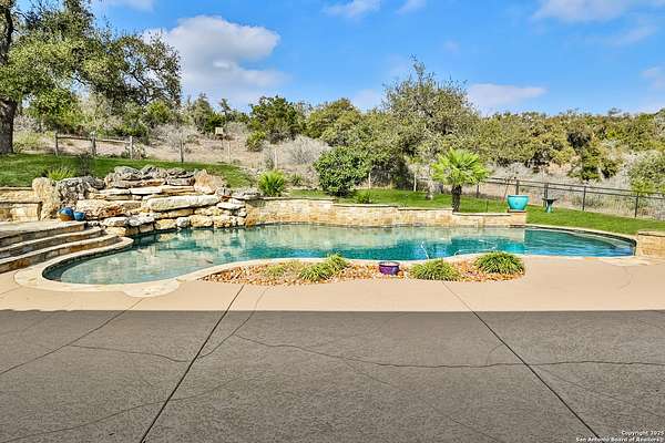 This stunning 4 bedroom, 3.5 bath custom crafted estate, built in 2014 by River Hills Custom Homes, is a true sanctuary of elegance and tranquility. Nestled on 5.54 secluded acres, this exceptional property offers unparalleled privacy and luxury. From its barreled cement tile roof to its artisan woodwork, every inch of this home was designed with meticulous attention to detail. Step through the grand arched metal front doors into a gated courtyard, where a tranquil fountain and garden space create an inviting entryway. Inside, soaring 18-foot vaulted ceilings with magnificent Douglas Fir wood beams set the tone for the home's warm yet sophisticated ambiance. Natural light floods the living space, highlighting the rich hardwood floors that flow seamlessly throughout. The dining room features a hand scraped, painted ceiling, adding a unique touch of elegance to the home's carefully curated design. The chef's kitchen is a perfect blend of form and function, designed for both culinary excellence and everyday convenience. At its heart, a Thermador gas range with six burners, a griddle, and a pot filler is framed by natural stone, creating a stunning focal point. Two dishwashers, a trash compactor, and custom cabinetry crafted from elegant painted maple wood elevate the space with both beauty and practicality. Double islands provide ample workspace for meal prep, while two farmhouse sinks ensure effortless cleanup. The primary suite is a private retreat designed for ultimate comfort and relaxation. The spa inspired bathroom features a luxurious steam shower with a rain shower head, a deep Jetta Garden Tub, and quartz countertops with his and hers vanities. Custom built-ins provide thoughtful storage, including pull out cabinets with electrical outlets and a heated towel rack for a true spa experience. His and Hers closets are nothing short of spectacular, with the primary closet spanning 15 by 11 feet and featuring a custom-built island, while the secondary measures 14 by 7 feet with floor to ceiling shelving. The three secondary bedrooms all offer large walk in closets and provide unique accommodations, with a guest suite featuring 2 private entrances and direct access to the pool area and its own courtyard. The remaining two bedrooms share a Jack and Jill bathroom and each have their own courtyard access, creating a seamless indoor - outdoor living experience. Designed for entertainment, the game room is an entertainers dream, boasting a wet bar, wine refrigerator, built in ice maker, and exquisite glass front lighted cabinetry. Throughout the home, smart features and premium amenities enhance everyday living. A whole house water filtration system ensures high quality water, while an in wall vacuum system makes cleaning effortless. The home is wired for surround sound, with speakers in the living room, game room, primary suite, and outdoor patio. Ethernet connections in every room provide seamless connectivity, and a Ring Security system with exterior cameras offers peace of mind. A gas fireplace anchors the outdoor lounge, while the gourmet outdoor kitchen is equipped with both a gas and wood-burning grill, perfect for hosting unforgettable gatherings. The centerpiece of the expansive backyard is the breathtaking 21,000-gallon Cody Pool, complete with a waterfall feature, sunbathing shelf, and volleyball-ready depth. As the sun sets, guests can gather around the natural wood-burning fire pit, surrounded by the peaceful beauty of the countryside. The oversized three car garage offers an additional W/D hook up location. A dedicated water well and storage tank offer self sufficiency, while an additional workshop provides extra storage for tools and equipment. This extraordinary home blends luxury, comfort, and impeccable craftsmanship, offering a truly unparalleled living experience in Waggener Ranch. Schedule your private showing today and discover the perfect balance of sophistication and serenity in this exceptional estate.