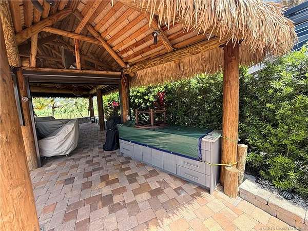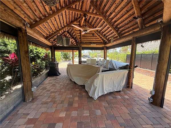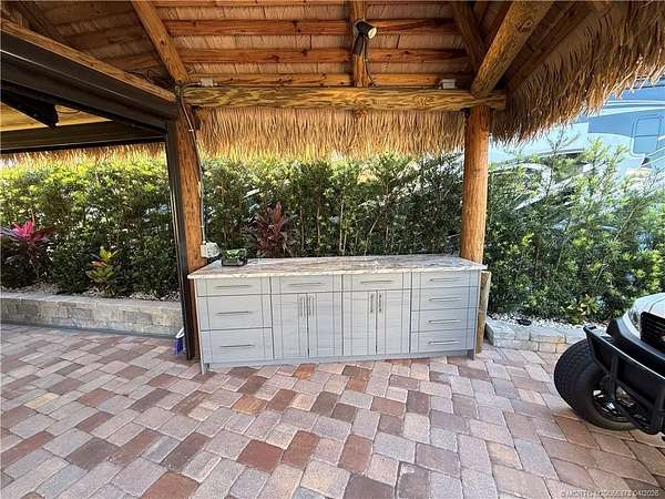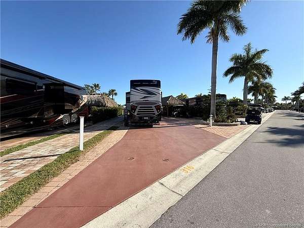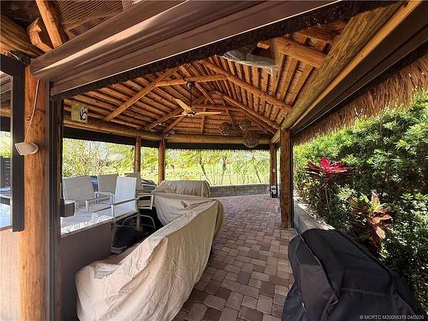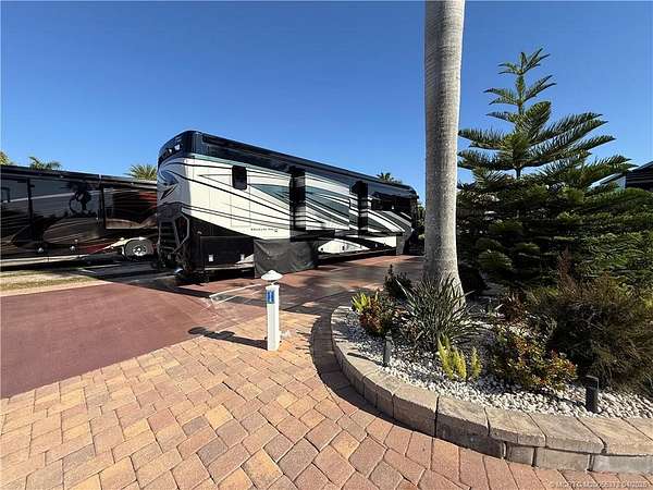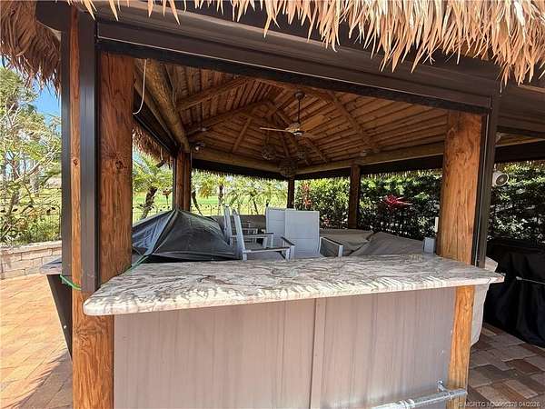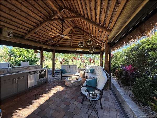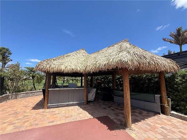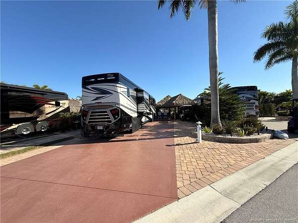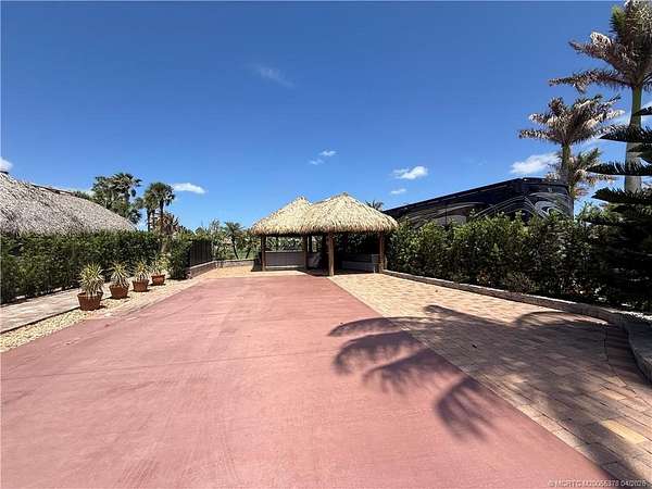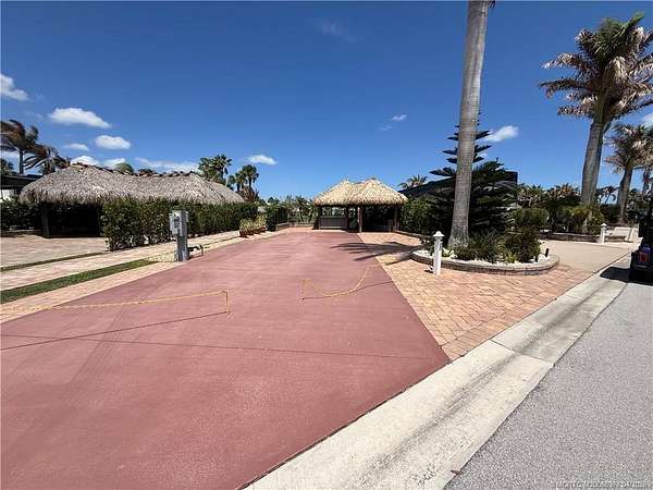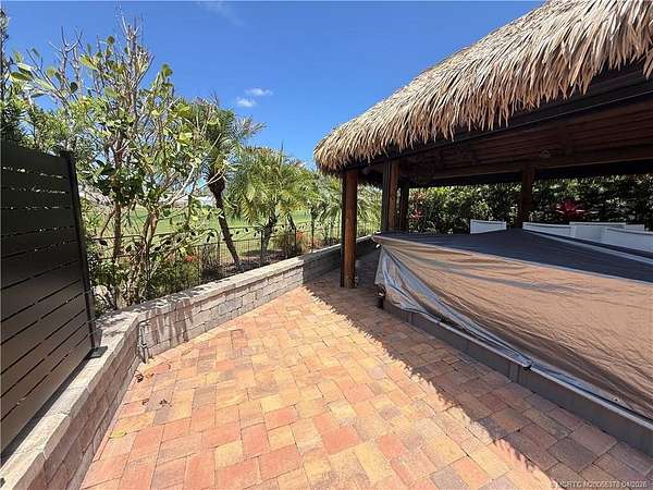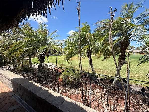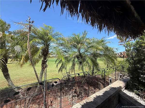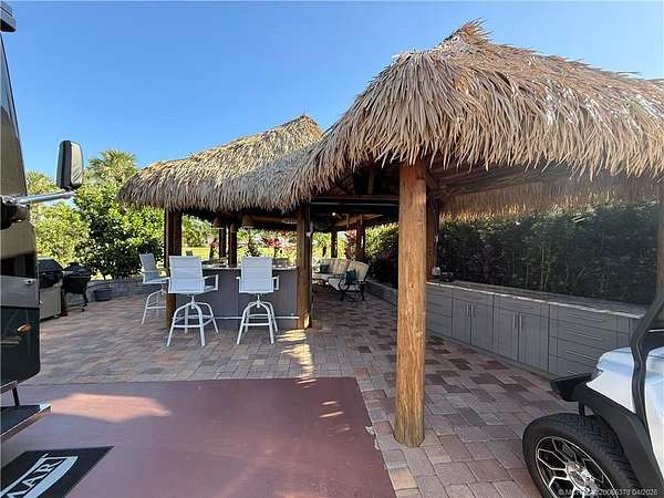 Perfectly positioned on an extra-wide, north-facing homesite, this exceptional lot captures sweeping views of the 8th and 9th holes, complemented by a serene lake with a lighted fountain and a picturesque bridge leading to the 8th hole-an idyllic setting to sit and read or just relax. Thoughtfully landscaped with raised beds and expansive paver patios, the property offers both privacy and polished curb appeal. The impressive L-shaped tiki is designed for elevated outdoor living, featuring upgraded marine-grade cabinetry with a granite countertop, plush, high-end furnishings, and remote-controlled screens that provide effortless comfort and privacy in any setting. Ideally located just moments from the main clubhouse, resort-style pool, sports facilities, and bark park, this lot combines luxury, convenience, and lifestyle-an outstanding opportunity to enjoy the very best of resort living.