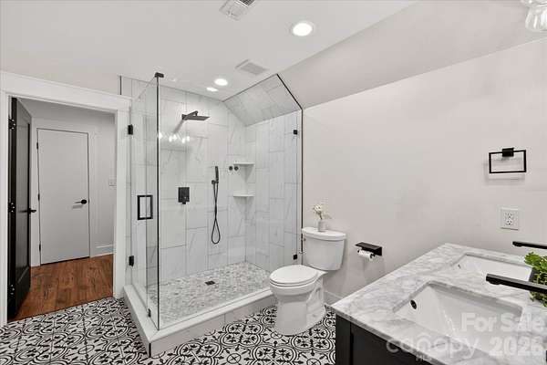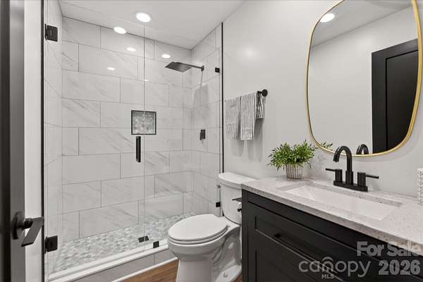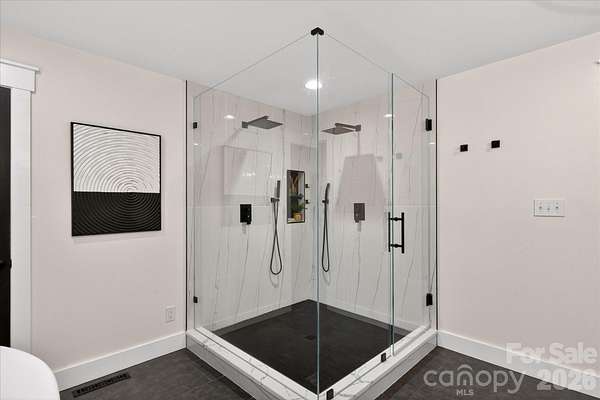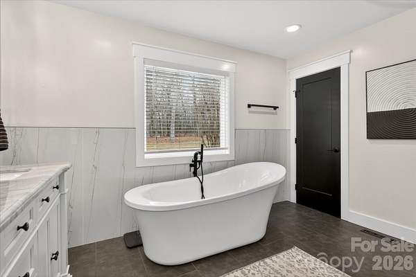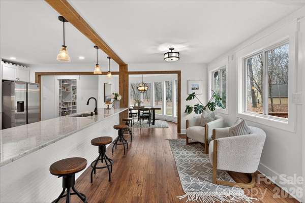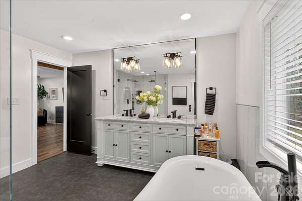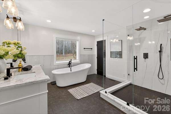 Lovely renovated farm house with primary on main situated on a gorgeous perfectly level 2.35 acre lot in picturesque Wesley Chapel and zoned for Weddington Schools. This beautiful home was upgraded from top to bottom in 2022! Gorgeous kitchen features an oversized extended island with quartz tops, ceiling height cabinetry, and stainless steel appliances. Kitchen overlooks both a beautiful breakfast area featuring a radius glass wall as well as a stunning Great Room with vaulted ceiling and fireplace. Gorgeous primary suite, conveniently located on the main floor, includes a large walk in closet plus stunning primary bath with vessel tub and oversized designer tile shower with dual rain head shower heads and sprayers. Main floor also features a private office with french doors. The second level includes three additional bedrooms, one with an en suite bathroom and double sink vanity with large walk in closet. The other two are accompanied by a jack and jill bathroom, and each room equipped with individual closets with custom built ins. Also on the second level is a 300 square foot bonus room accessible via a secondary staircase. The real gem of this property is the expansive yard. This lovely home features over 2 acres of privacy with both mature trees and lots of green space. Perfect space to take in the wonderful North Carolina weather! MOVE IN READY!