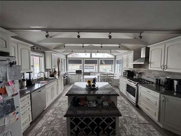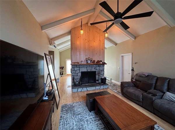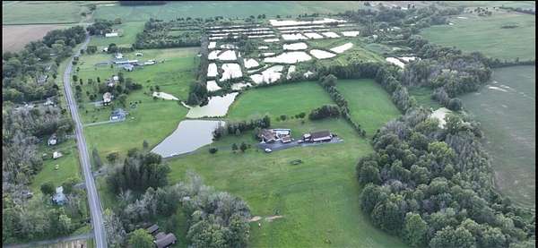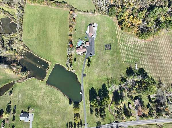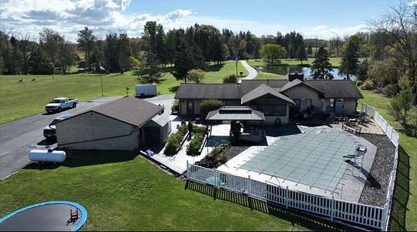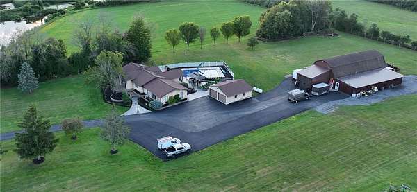 Welcome to this beautifully maintained 2,400 sq ft, 3-bedroom, 2-bath ranch home set on almost 8 flat, manicured acres of picturesque land. Surrounded by mature, groomed landscaping, this property offers privacy, functionality, and resort-style living-complete with a fully stocked pond and dock. Inside, the home features numerous high-end updates designed for comfort and efficiency. Enjoy a 5-zone heat pump system with both heating and air conditioning, complemented by boiler baseboard and radiant heat. Additional upgrades include a tankless water heater and a 22kW whole-house backup generator for peace of mind year-round. The heart of the home is the bright, remodeled kitchen, boasting expansive granite countertops, abundant cabinetry, and a welcoming breakfast nook-perfect for casual dining and entertaining. The layout also includes a cozy living room with a wood-burning fireplace, a formal dining room with French door access to a paver patio, and a large bonus/family room offering flexible living space. The exterior amenities are equally impressive. The property includes a 2-car detached garage, a small greenhouse, and a 20x40 inground pool surrounded by a spacious stampcrete patio, ideal for summer enjoyment. Adjacent to the pool are several raised garden beds constructed of stone accompanied by a green house. A standout feature is the 3000 sq ft, two-story barn, fully equipped with a hot water boiler, tankless water heater, and a 24k BTU heat pump system, plus lean-tos on all sides for dry storage. Additional storage is provided by a 20x20 shed with radiant heat. Select furnishings may be included, making this exceptional property truly move-in ready. This one-of-a-kind estate seamlessly blends comfort, efficiency, and outdoor living-perfect for those seeking space, versatility, and tranquility. Delayed negotiations until Saturday 1/10/25 @ 12pm.
