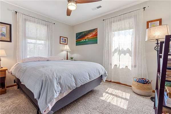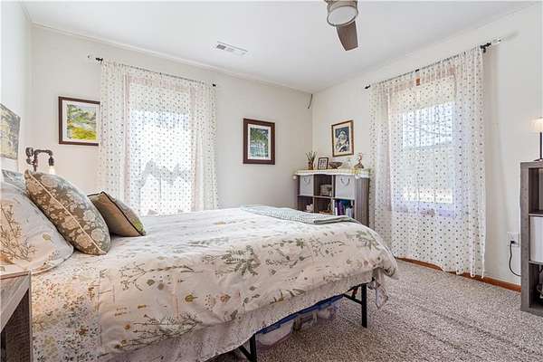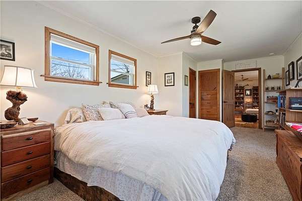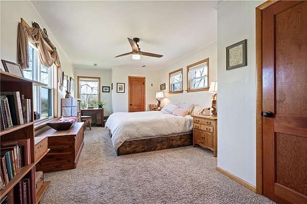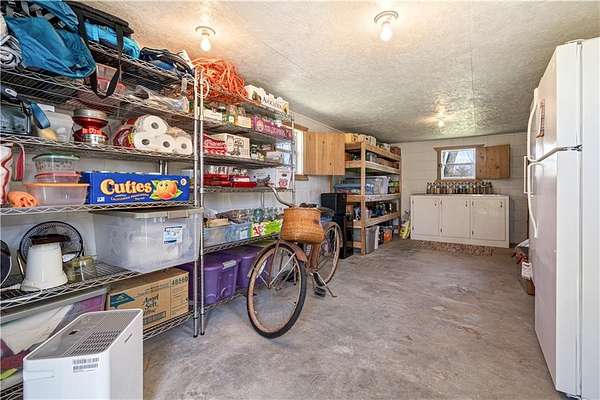 - Attic Storage, Blinds, Built-Ins, Ceiling Fans, Ice Maker Connection, Quartz Counters, Woodstove