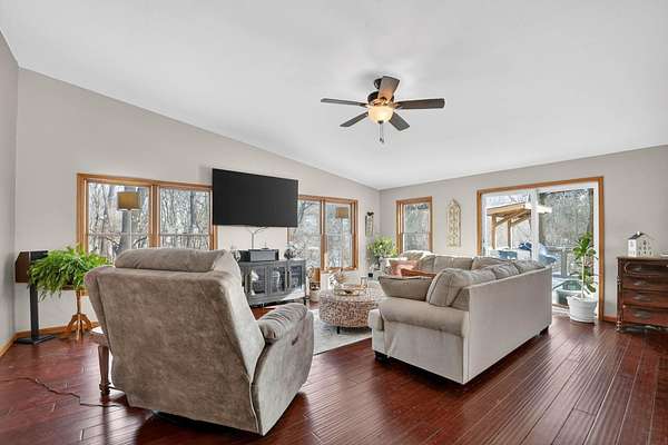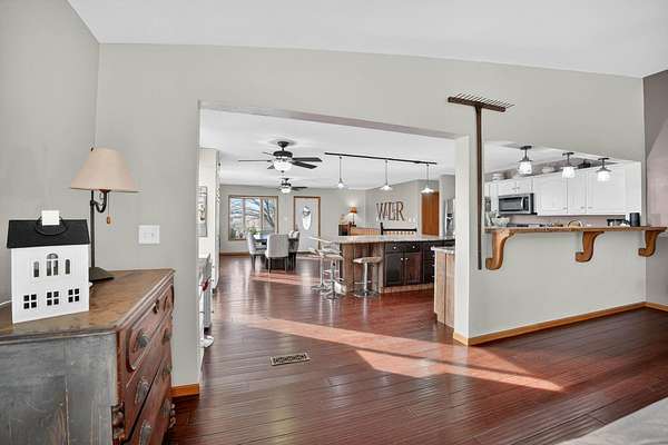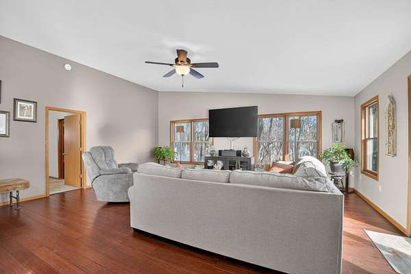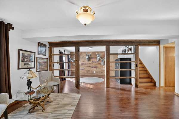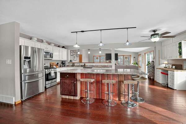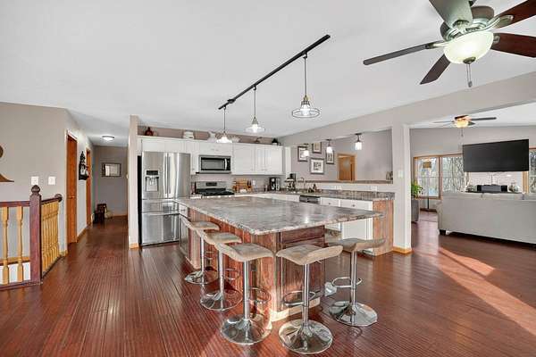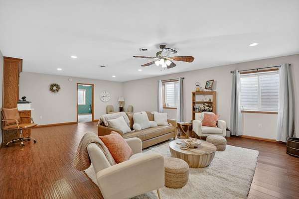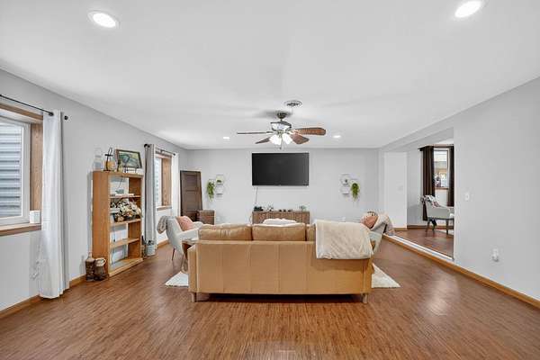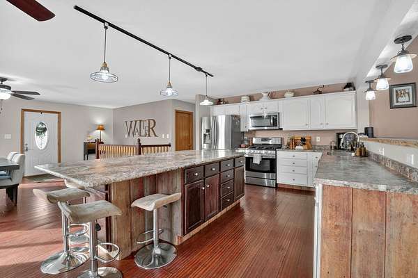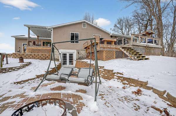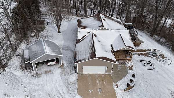 One-of-a-kind acreage property in New Hartford offering space, privacy, and views rarely found on the market. This impressive 6-bedroom, 3-bath home features a thoughtfully designed addition that created expansive living areas and a flexible floor plan ideal for today's lifestyles. The main level offers three spacious bedrooms and convenient main-level laundry, providing everyday comfort and functionality. The large kitchen features an oversized island, perfect for gathering, entertaining, and meal prep, and flows seamlessly into the generous living and dining spaces. Two additional bedrooms are located in the basement, offering excellent flexibility for guests, multi-generational living, or private work and hobby areas. Set on 9.37 scenic acres, the property showcases breathtaking views of timber and rolling countryside-best appreciated in person. Outdoor enthusiasts will love the privacy, abundant wildlife, and endless recreational opportunities, making this a true hunter's and outdoor paradise. Three outbuildings add exceptional value, offering ample storage and versatility for equipment, vehicles, or workshop use. Enjoy peaceful country living with room to roam, all while remaining conveniently close to New Hartford amenities. Acreage, views, and space-this rare opportunity is truly a must-see.