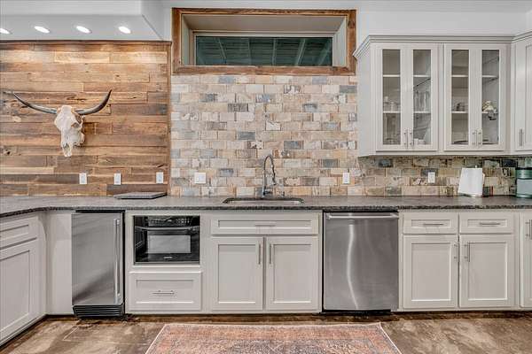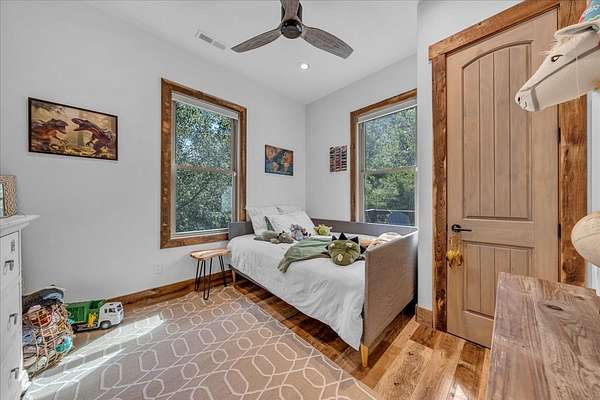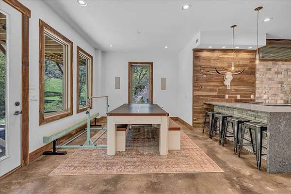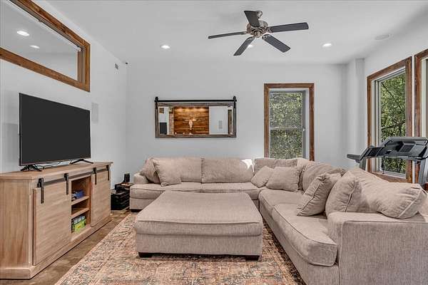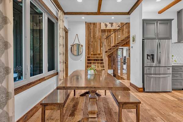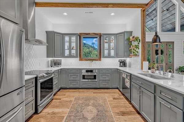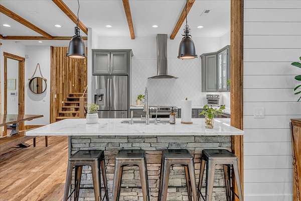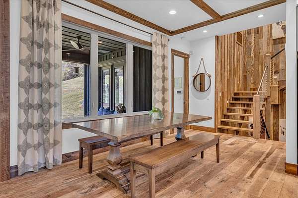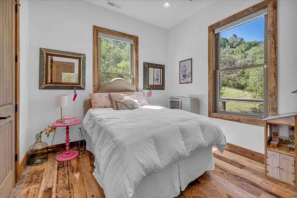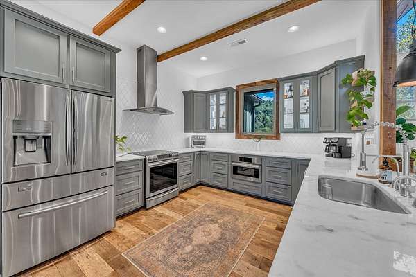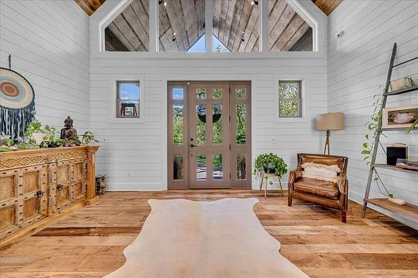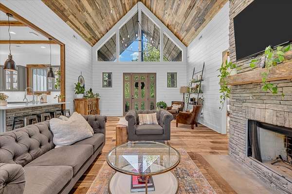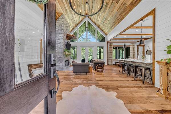 Additional upgrades include wood floors and trim reclaimed from a 100-year-old barn on the property, a whole-house water filtration system, Cat 6 wiring, fiber internet, four HVAC systems, spray foam insulation, and app-controlled smart lighting and thermostats. The home is secured with cameras and monitoring inside and out.