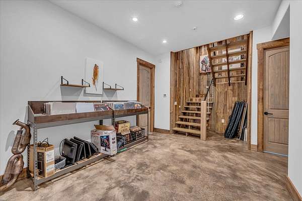 The primary suite includes radiant floor heating, dual shower heads with rainfall option, and spa-like finishes. A dedicated wellness/gym room has dual fans, impact-resistant flooring, and its own HVAC system with smartphone control. The lower level offers a theater room with surround sound, stained concrete floors, plus a large underground storage area and a safe room.