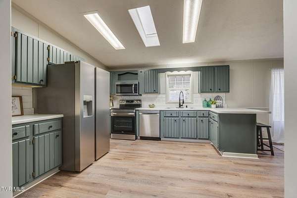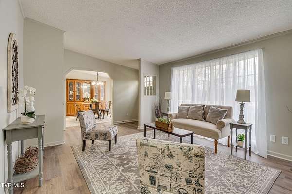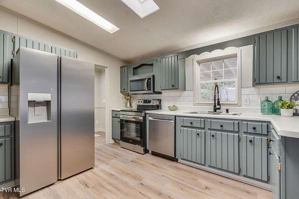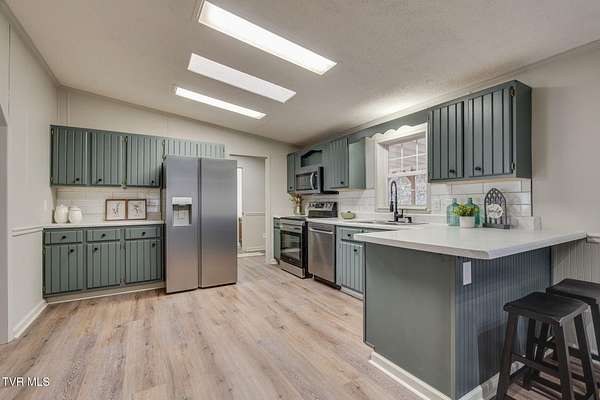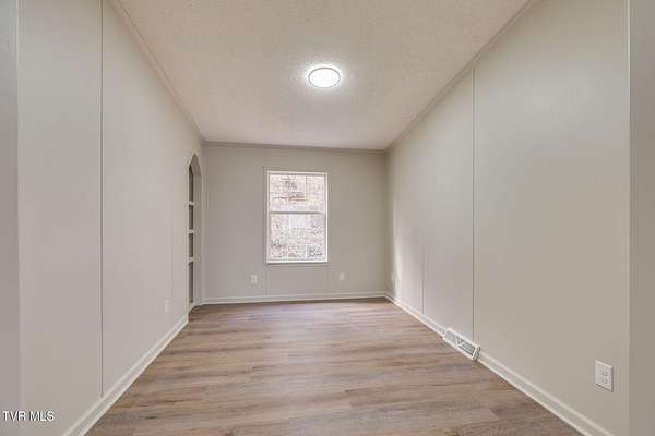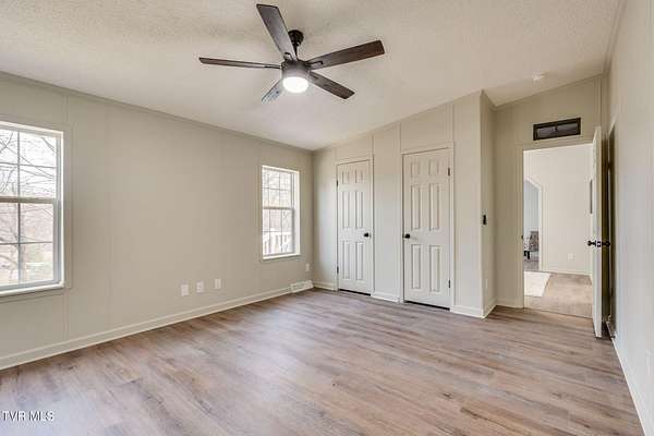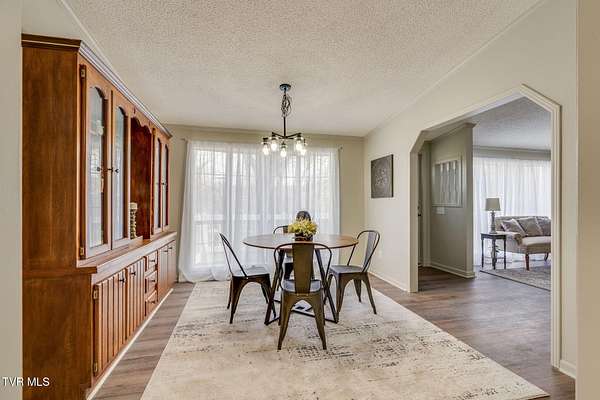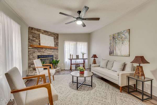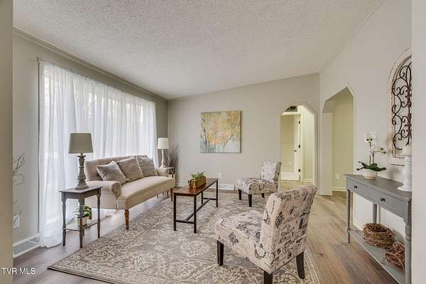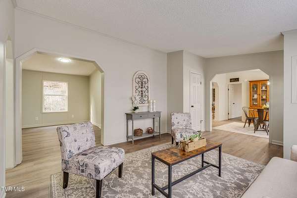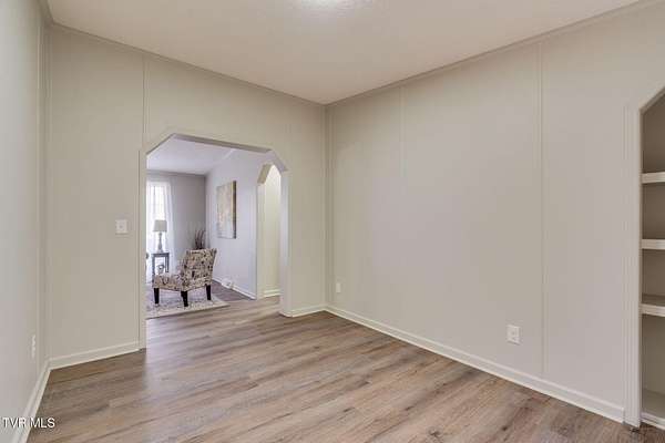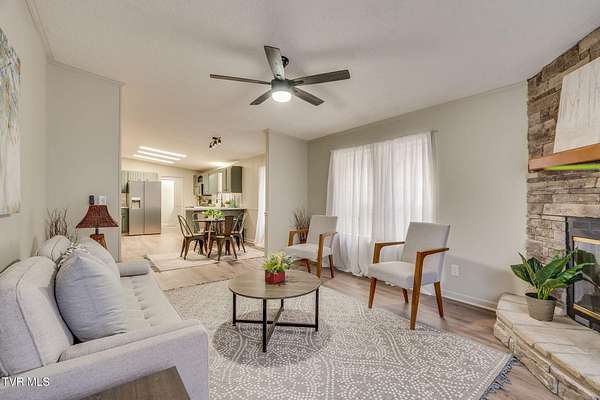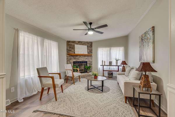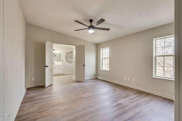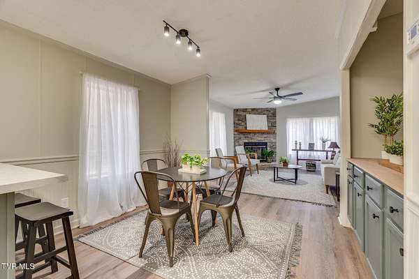 Newly renovated home in Erwin on 1.5 acres! This one-level home features new flooring throughout, a large front porch, and lots of space to spread out! From the entry hall is a formal dining room, with built-in cabinets, and a large living room - each with bay windows to maximize natural light. The kitchen has newly painted cabinets, stainless steel appliances, an eat-in bar, and a skylight. It is open to the cozy den with its stone, gas fireplace. The split floor plan places the primary suite with 2-closets and an ensuite bathroom on one side of the home and the other two bedrooms and full bathroom on the other side. If that's not enough space, there is even a bonus room that could be used as an office, craft room, or even another bedroom. There is also a 1/2 bath and a laundry room which exits to the covered back deck. The home sits on a wooded lot providing lots of privacy but is still conveniently located near interstate access and the town of Erwin.