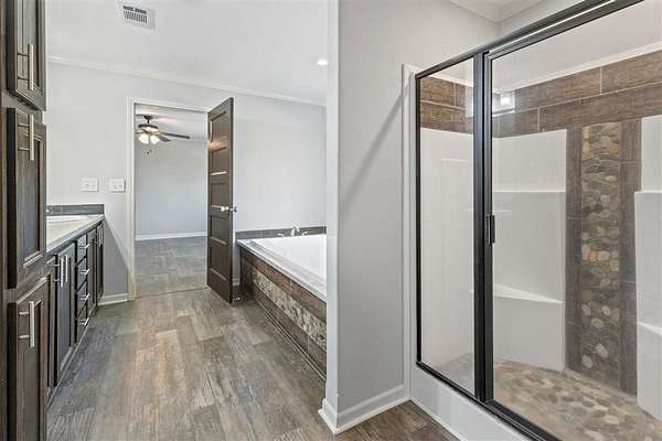 - Bathtub, Beamed Ceilings, Built-In Features, Ceiling Fan(s), Formica Counters, Kitchen Island, Kitchenopentofamilyroom, Open Floorplan, Pantry, Shower, Shower in Tub