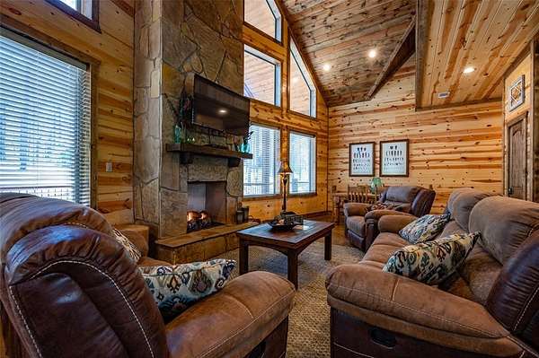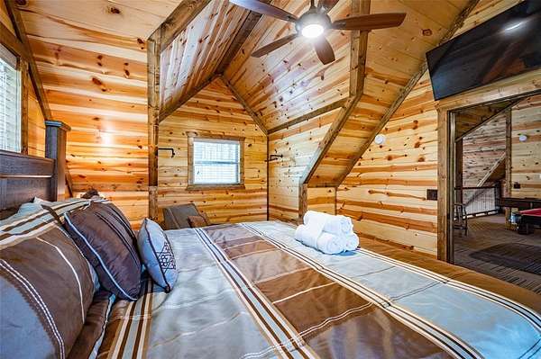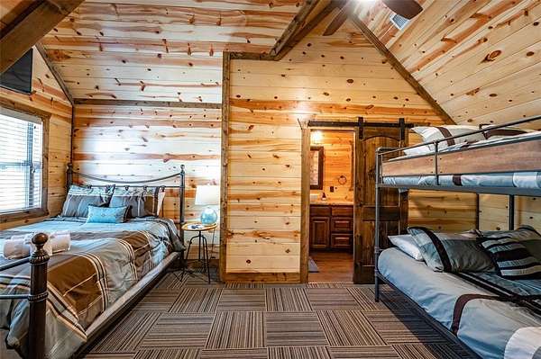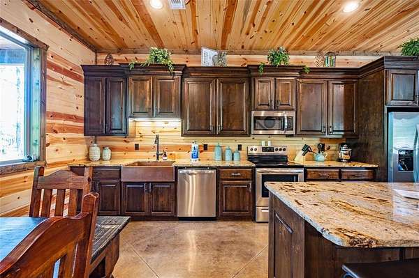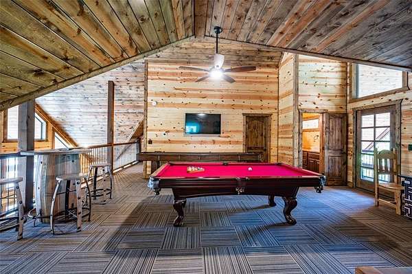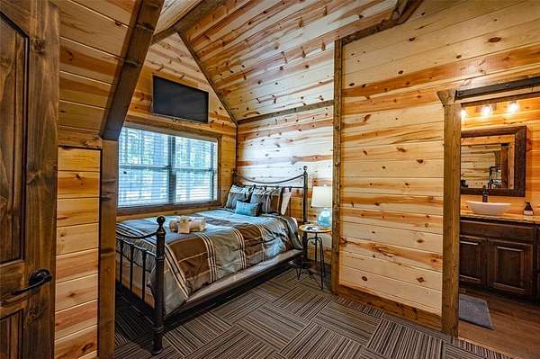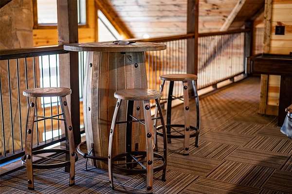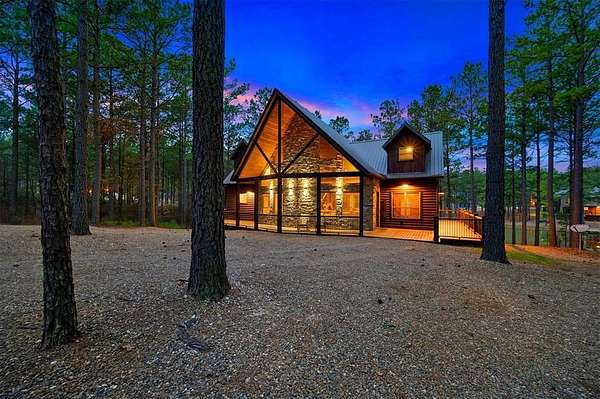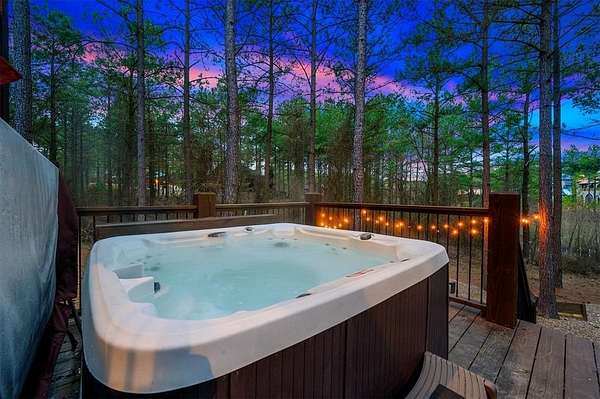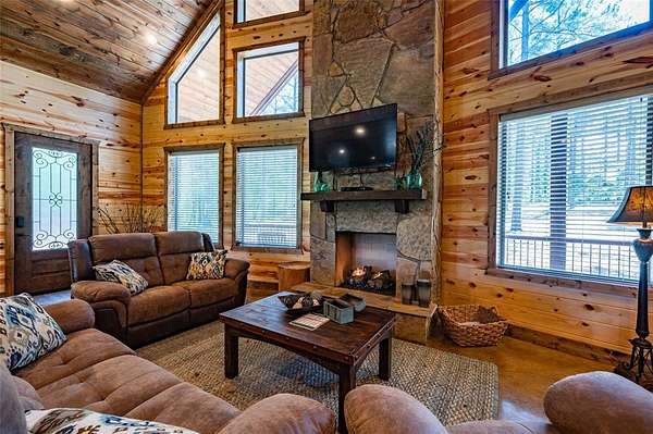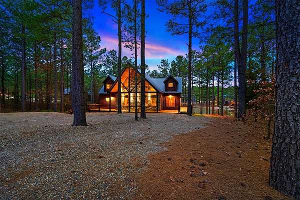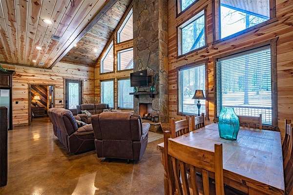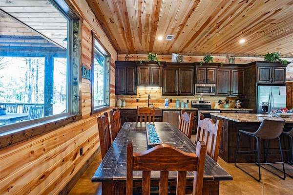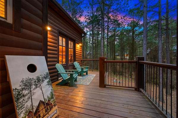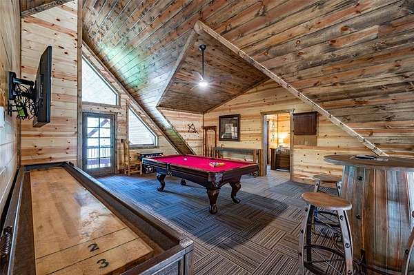 Lake View Hideaway cabin is located on a gorgeous pond, surrounded by towering, mature pines and smooth, wide, asphalt roads make this development the place everyone wants to be. Lake View Hideaway is a LUXURY vacation cabin in Beavers Bend that features a private dock on the Pine Hill Pond, 3 bedrooms with king size beds, 1 bedroom with a set of queen over queen bunk beds plus another queen bed. Maximum occupancy 16. Each downstairs bathroom has stylish vessels, rich granite, custom walk-in tile showers and the master has a hammered copper soaking tub. Both upstairs bathrooms have tubs with tile surrounds, vessel sinks and granite counters. The two upstairs bedrooms are separated by a loft with pub table and a sofa. The loft also includes a pool table, shuffleboard, and retro video arcade cocktail table. The arcade has 60 games including: Mrs. Pacman, Galaga, Frogger and many more. The loft opens to a balcony with an awesome view of the water. As with the best cabins in Beavers Bend, the kitchen is complete with beautiful granite counter tops, stainless appliances and a hammered copper, farmhouse sink. The island offers additional barstool seating for four guests and transitions into the dining area. Family dining is a luxury while vacationing in Beavers Bend. You will want to relax outdoors and enjoy the peaceful sounds of the wilderness. The back patio has a gas fireplace and views of the Pine Hill Pond every which way you look! Fire up the gas grill and let the grill meister of your group impress you with their BBQ skills. The hot tub is on the deck just off the back patio and is big enough for 6-7. If you prefer a little activity, there is a corn hole/ladder ball game and a horseshoe pit. The kids will enjoy the outdoor playground fort. Gross Rental Income for 2022 $157,373. Gross Rental Income for 2023: $134,502. $93,000 booked through May 2024. Take a tour by viewing the walkthrough video. For a YouTube walk through video, contact the Listing Agent