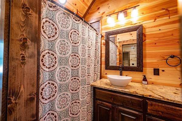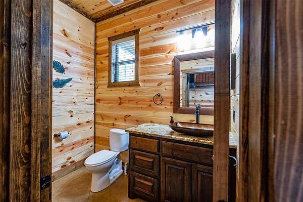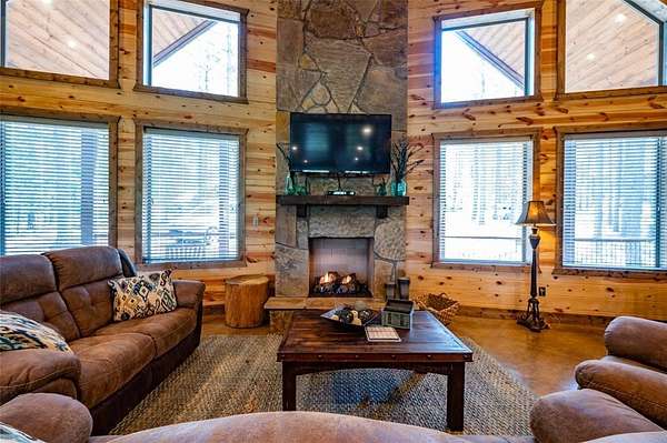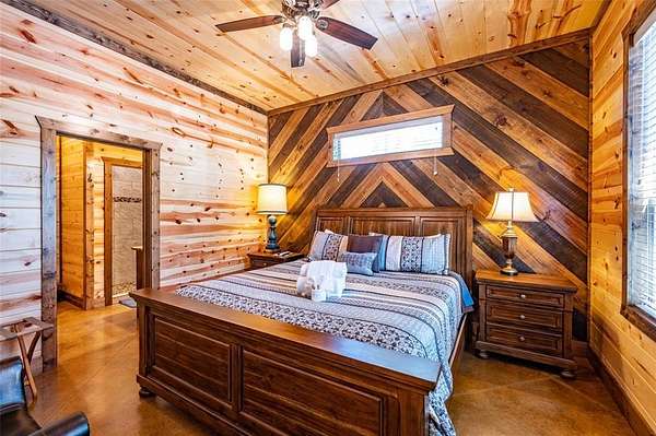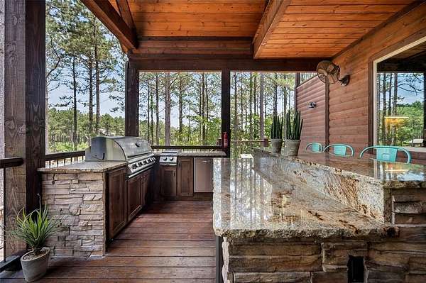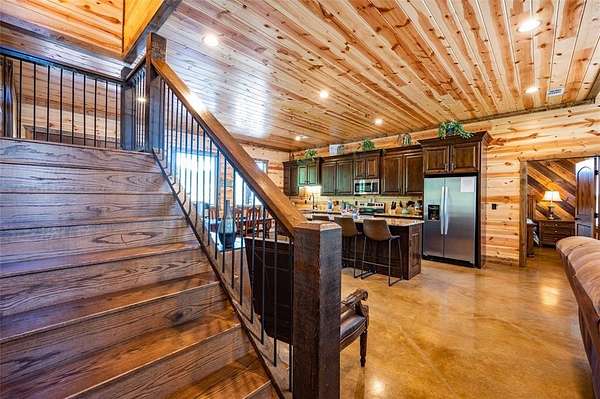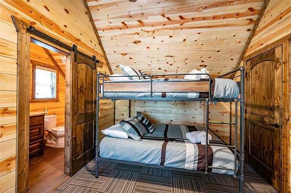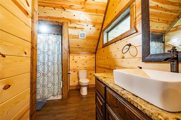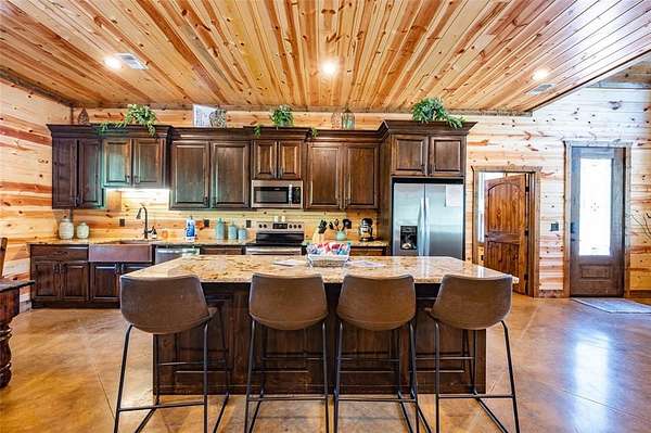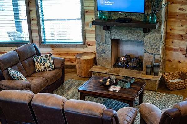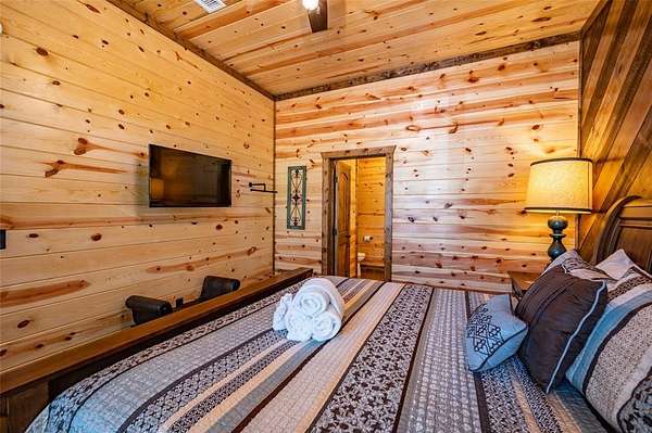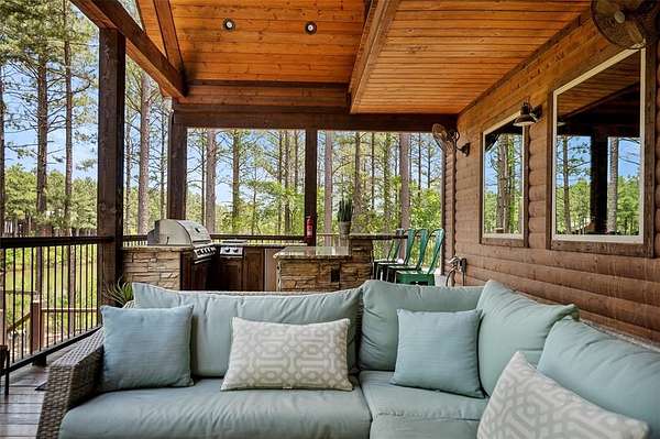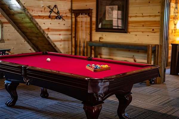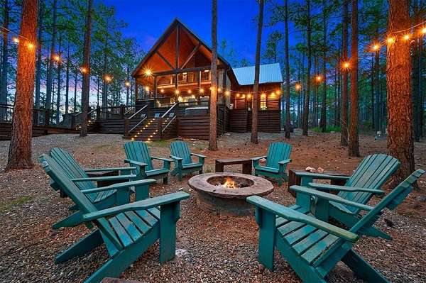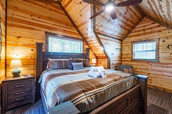 Lake View Hideaway cabin is located on a gorgeous pond, surrounded by towering, mature pines and smooth, wide, asphalt roads make this development the place everyone wants to be. Lake View Hideaway is a LUXURY vacation cabin in Beavers Bend that features a private dock on the Pine Hill Pond, 3 bedrooms with king size beds, 1 bedroom with a set of queen over queen bunk beds plus another queen bed. Maximum occupancy 16. Each downstairs bathroom has stylish vessels, rich granite, custom walk-in tile showers and the master has a hammered copper soaking tub. Both upstairs bathrooms have tubs with tile surrounds, vessel sinks and granite counters. The two upstairs bedrooms are separated by a loft with pub table and a sofa. The loft also includes a pool table, shuffleboard, and retro video arcade cocktail table. The arcade has 60 games including: Mrs. Pacman, Galaga, Frogger and many more. The loft opens to a balcony with an awesome view of the water. As with the best cabins in Beavers Bend, the kitchen is complete with beautiful granite counter tops, stainless appliances and a hammered copper, farmhouse sink. The island offers additional barstool seating for four guests and transitions into the dining area. Family dining is a luxury while vacationing in Beavers Bend. You will want to relax outdoors and enjoy the peaceful sounds of the wilderness. The back patio has a gas fireplace and views of the Pine Hill Pond every which way you look! Fire up the gas grill and let the grill meister of your group impress you with their BBQ skills. The hot tub is on the deck just off the back patio and is big enough for 6-7. If you prefer a little activity, there is a corn hole/ladder ball game and a horseshoe pit. The kids will enjoy the outdoor playground fort. Gross Rental Income for 2022 $157,373. Gross Rental Income for 2023: $134,502. $93,000 booked through May 2024. Take a tour by viewing the walkthrough video. For a YouTube walk through video, contact the Listing Agent