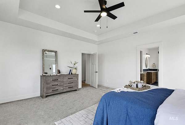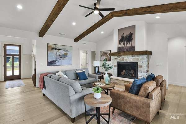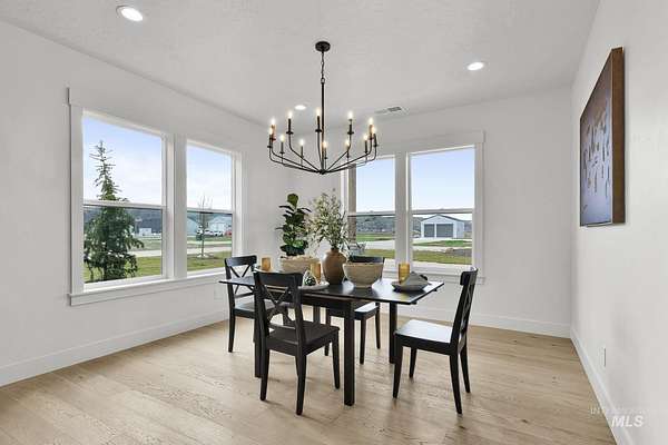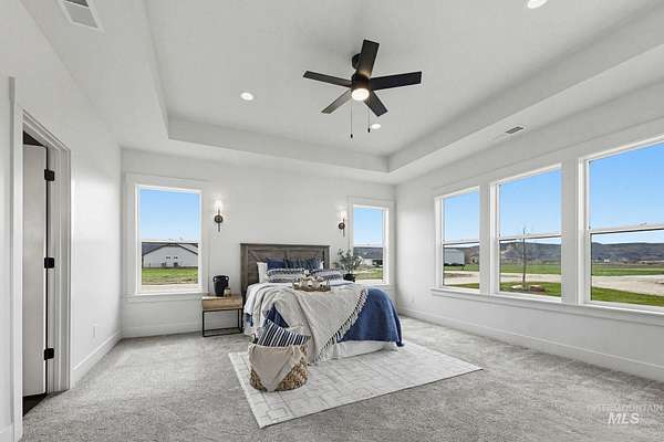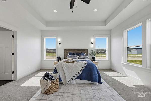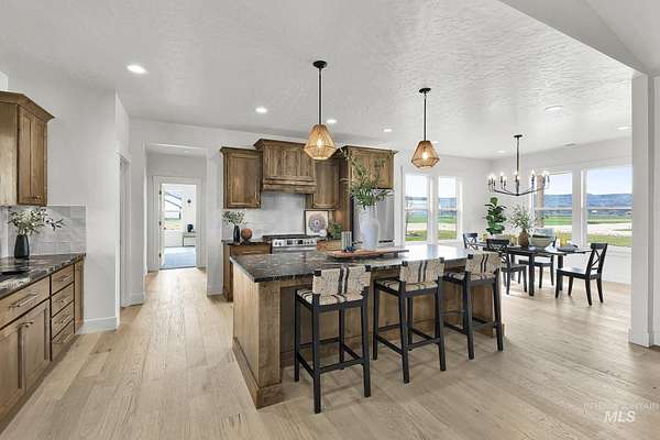 Stunning views await on this fully usable 5-acre homesite just outside Emmett city limits. This thoughtfully designed split-bedroom single level home is 2477 sq ft and offers 4 bedrooms and 3 full bathrooms. You'll find an open-concept layout which creates an inviting atmosphere ideal for both everyday living and entertaining. The kitchen is outfitted with striking Titanium Gold Supreme granite with a functional layout. Sit on the east facing covered patio every morning and watch the sun rise from behind the mountains. The primary suite is designed as a private retreat with a spacious bedroom and a well appointed ensuite with dual vanities and a large walk-in closet. Escape the hustle and bustle and enjoy wide-open Idaho living with all the space you need for a dream shop, animals, and large garden...you can do it all here!
