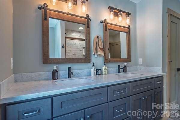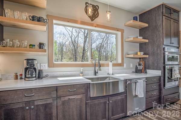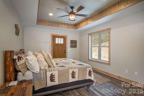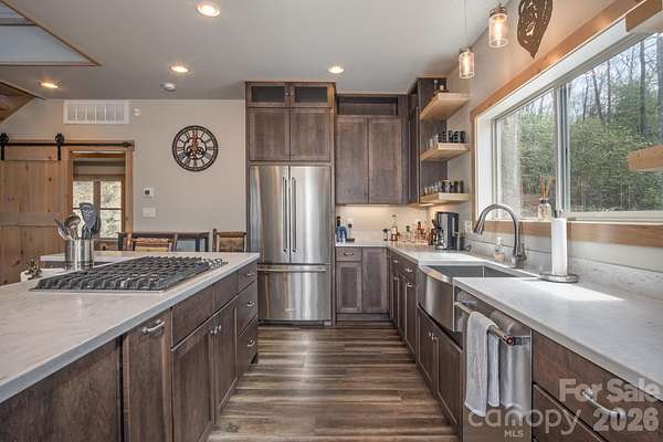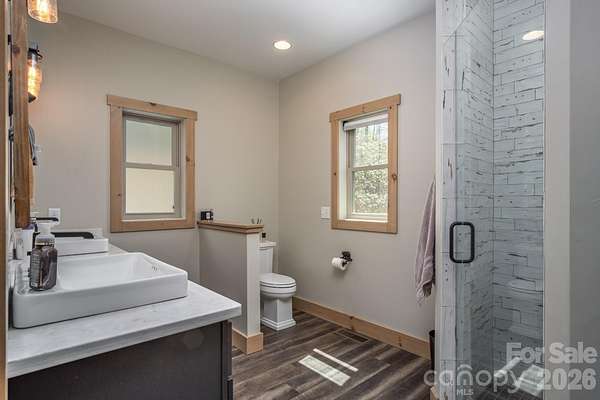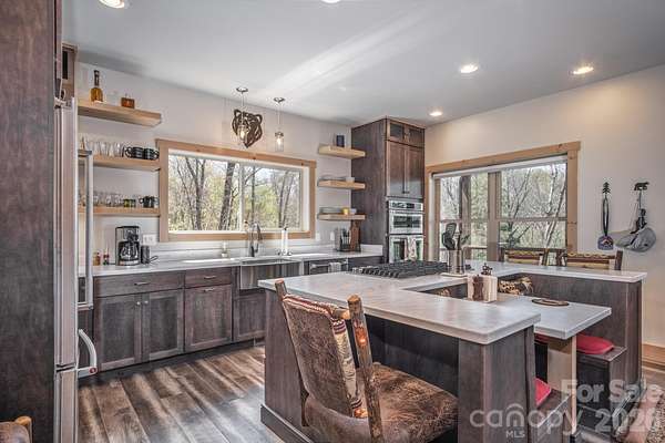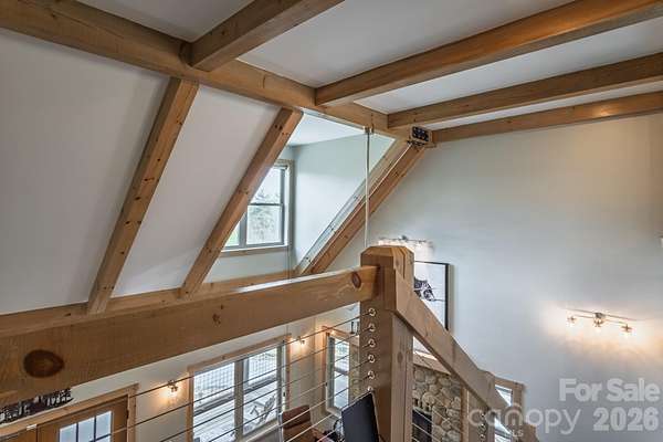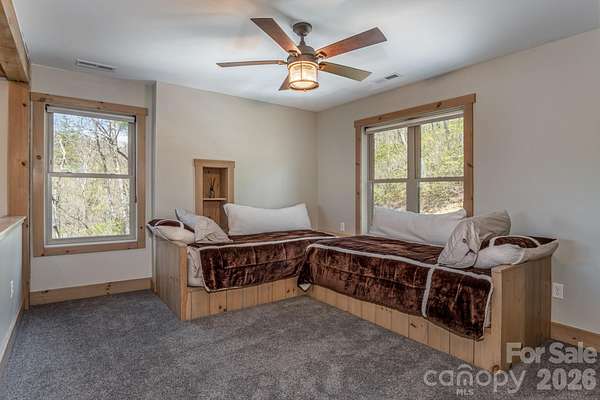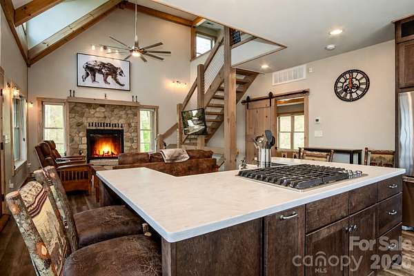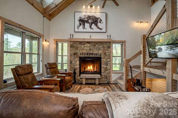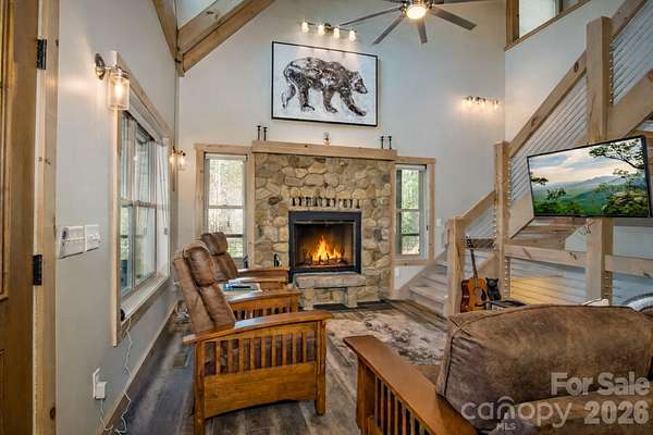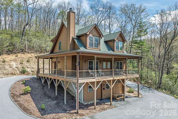 Turnkey furnished mountain retreat on 3.7 private acres with stream, views, and complete privacy-no neighbors in sight. Short-term rentals allowed, making this the perfect personal getaway or income-producing investment. 3171 East Fork Road - This mountain cabin blends classic cabin charm with mountain modern design, privately situated in Brevard, NC. Built by Going Green Builders, this 3-bedroom, 3-bath home offers exceptional privacy, a small stream, and peaceful short-range wooded mountain views, all just 10.8 miles from Historic Downtown Brevard and only 12 minutes to DuPont State Forest with its miles of hiking, biking, horseback trails, and renowned waterfalls. Be sure to explore the Matterport 3D virtual tour to fully experience the layout, craftsmanship, and flow of this unique home. Designed for efficiency and comfort, the home features 2x6 exterior walls and spray foam insulation. A paved circular driveway and additional paved access provide easy entry and generous parking, including a lower-level one-car garage with workshop space plus exterior parking for six or more vehicles. Inside, the open-concept layout showcases a striking post-and-beam stairwell and abundant natural light. The kitchen is a true centerpiece with custom built-in bench seating at the island, bar seating on two sides, Caesarstone countertops, farmhouse stainless sink, and KitchenAid stainless appliances including a five-burner propane cooktop and three-door refrigerator. The space flows seamlessly into the great room featuring soaring 15'6" ceilings, exposed wood beams, clerestory windows, and a native stone fireplace with solid stone hearth and gas starter. The main-level primary suite offers privacy, a sliding barn door entry, direct access to covered decking, a walk-in closet, and a beautifully appointed bath with double vessel sinks and a fully tiled walk-in shower. Upstairs, a custom staircase with cable railing leads to a versatile loft ideal for a sleeping area, office, or flex space, along with an additional spacious bedroom and a full bath featuring tiled tub surround, glass enclosure, double sinks, and ample cabinetry. The lower level provides additional living space with a finished den and exterior access, a full bath, laundry area with stackable washer and dryer, and a nearly completed room ideal for a future bedroom, guest suite, or office. With minimal finishing and the addition of a mini-split system, this level offers excellent expansion potential. Outdoor living is a highlight with extensive, highly private covered decking designed for entertaining or simply relaxing while enjoying the natural surroundings, wooded views, and the gentle sounds of the nearby stream. The setting offers rare privacy with no visible neighboring homes. Additional features include high-speed internet availability, private well with excellent water quality, and a 3-bedroom septic permit. Light restrictive covenants allow for horses and chickens. Offered furnished with custom pieces designed for the home, with only one bed excluded, this property presents a rare turnkey opportunity for a private mountain retreat or full-time residence.