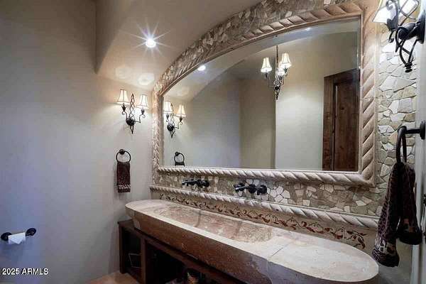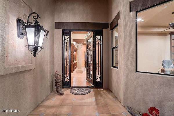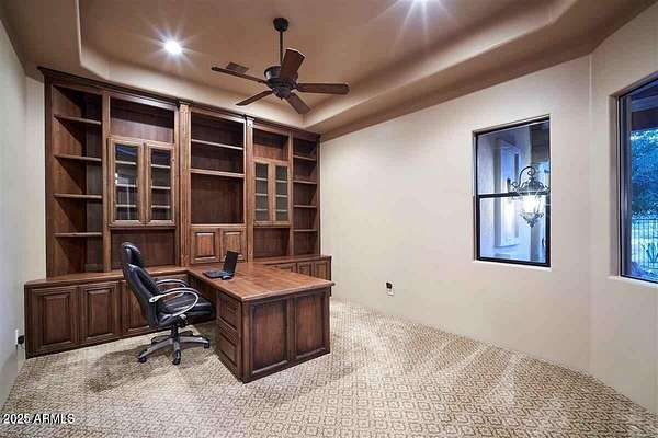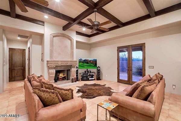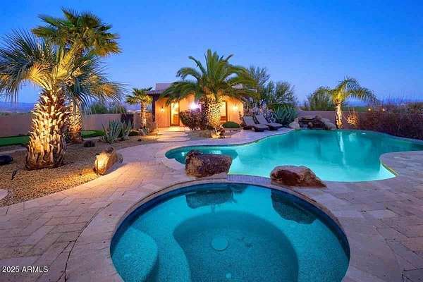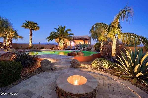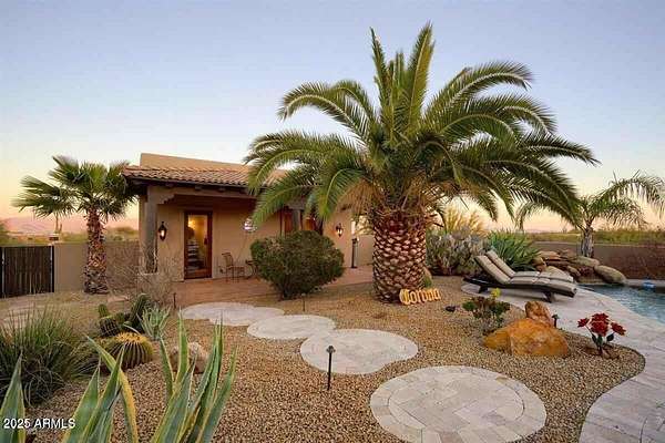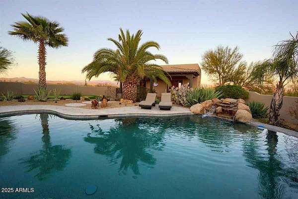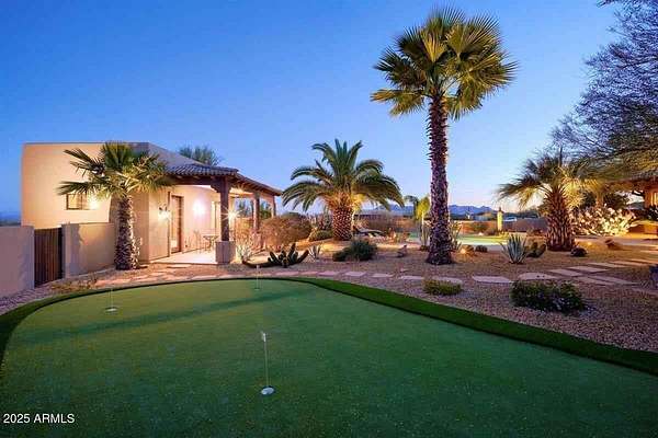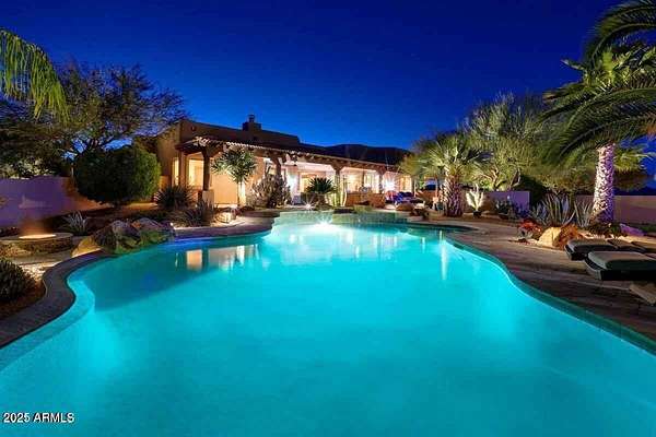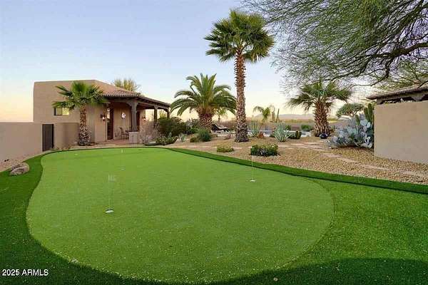 Unfurnished Picturesque 360 Mountain Views abound in this exquisite, charming Hacienda set on approximately 1.6+ acres. Great room floor plan flows perfectly for entertaining and family gatherings. Main home features 4 bedrooms with walk in closets, 3.5 baths and a separate office with built in bookshelves. Detached welcoming casita with bedroom, full bath and kitchenette. High end finishes include solid alder doors & cabinets, stainless steel appliances, Canterra stone, decorative accent tile & slab granite. 100-Year-Old Mesquite Wood doors, sprawling covered back patio with BBQ, fireplace, fire pit, sparkling pool, fountain and putting green. 3 car garage.