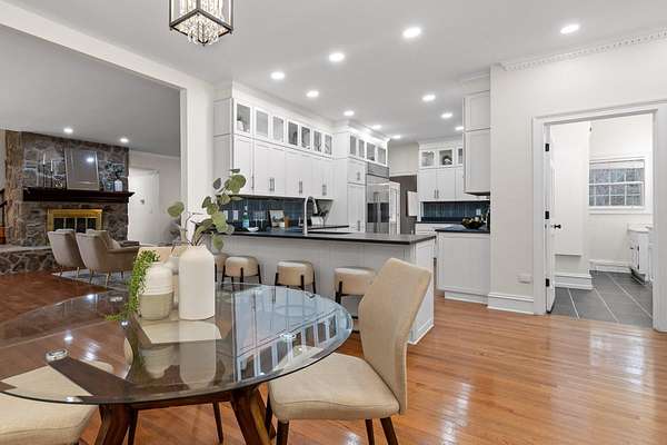 The kitchen blends beauty and function with extensive custom cabinetry, rich leathered granite, and a vertical kit-kat tile backsplash for a modern designer touch. Professional-grade appliances, an extended peninsula with bar seating, and a bright eat-in nook create a warm, effortless space for daily living.