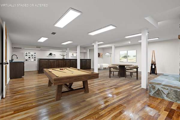 The expansive finished basement becomes its own destination--complete with hardwood floors, a long custom bar, a private vaulted safe room, and another stone fireplace.