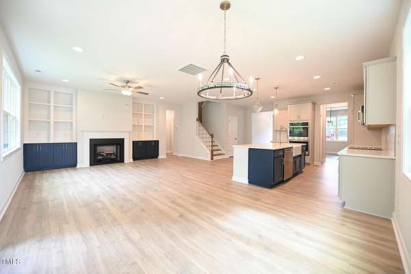 - Bathtub/Shower Combination, Bookcases, Butler's Pantry, Ceiling Fan(s), Coffered Ceiling(s), Crown Molding, Dining L, Double Vanity, Eat-In Kitchen, High Ceilings, Kitchen Island, Nursery, Open Floorplan, Primary Downstairs, Quartz Counters, Smooth Ceilings, Walk-In Closet(s)