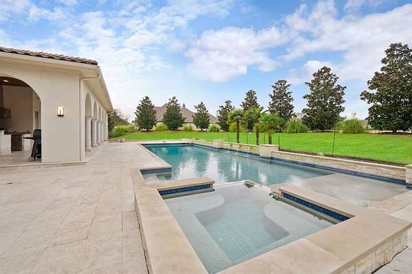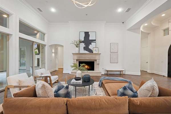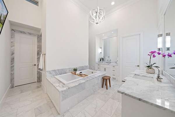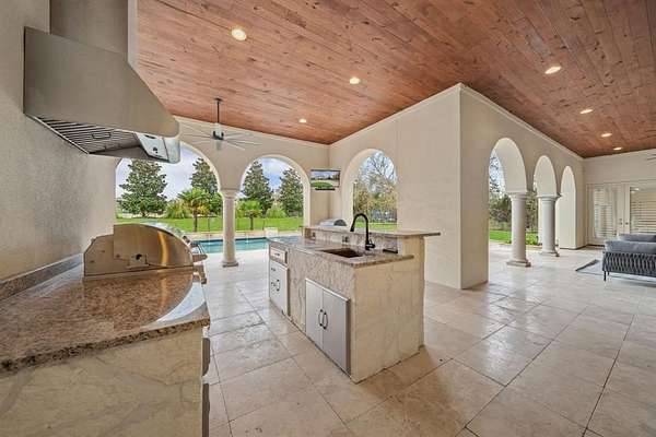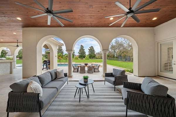 The open-concept great room, kitchen, and dining areas create a seamless flow--ideal for entertaining and everyday living. Wall-to-wall glass doors open to an impressive outdoor living experience with covered lounge seating, al fresco dining, and a fully equipped summer kitchen. The resort-style pool is framed by lush landscaping, providing exceptional privacy and tranquility.