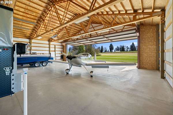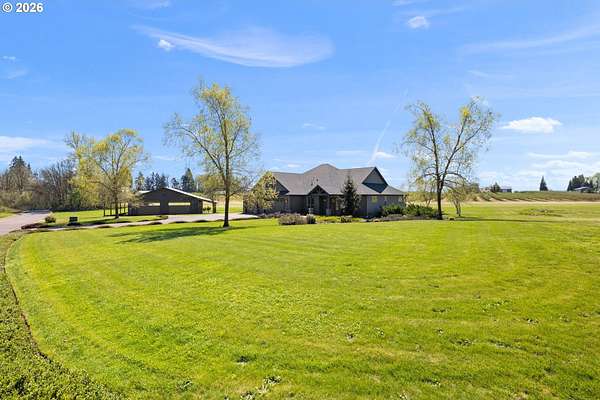 Falcons Landing beauty on Sunset Airstrip (1OR3)! This exceptional, essentially single-level home features 3 spacious bedrooms, a den, formal dining, and a great room-style living area highlighted by a floor-to-ceiling custom fireplace, 10' ceilings, designer lighting, and expansive windows that capture beautiful views. The gourmet kitchen is equipped with double convection ovens and designed for both everyday living and entertaining. The large primary suite offers a luxurious ensuite, huge walk-in closet all conveniently located on the main level. A bonus room upstairs provides flexible space for guests, media, or hobbies. Situated on 4 level acres - with approximately 3 acres usable w/ in-ground sprinkler system, beautiful landscaping with lighting & a 2018 Kubota tractor w/ attachments to make your life easy! - the property includes an impressive 50'x 40' hangar featuring a 40' x 12' hydraulic Higher Power hangar door and two 12' x 16' garage doors, ideal for aviation, storage, or workshop needs. Quick to Hwy 26! Be sure to watch the video and request the Features & Updates list from your Realtor for detailed understanding of everything this incredible property offers.