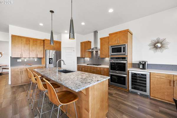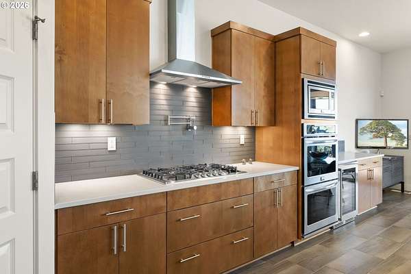 - Builtin Oven, Builtin Range, Convection Oven, Dishwasher, Disposal, Double Oven, Free Standing Refrigerator, Gas Appliances, Island, Microwave, Pantry, Pot Filler, Quartz, Range Hood, Solid Surface Countertop, Stainless Steel Appliance, Tile, Wine Cooler