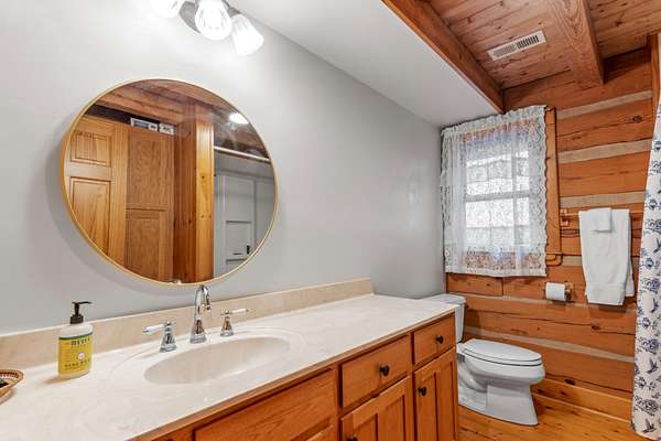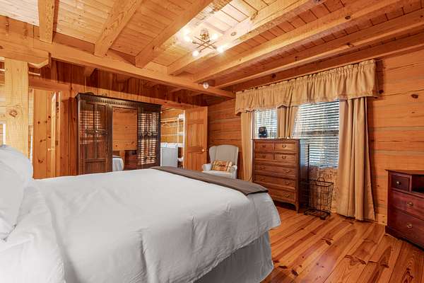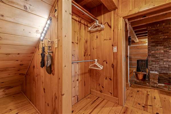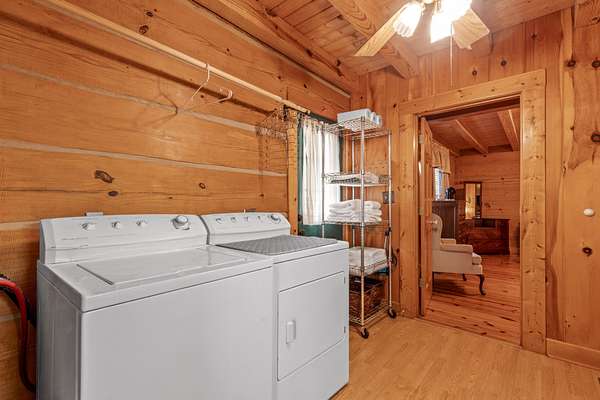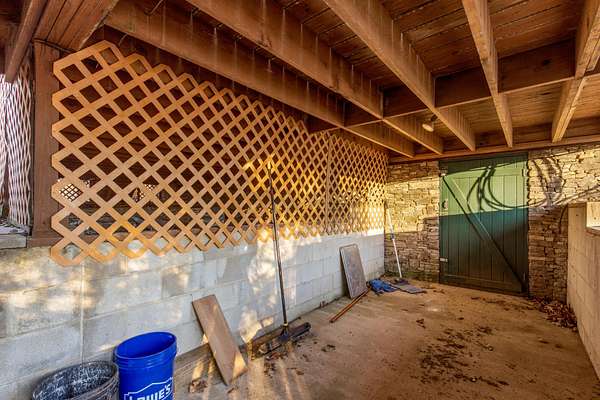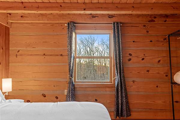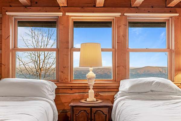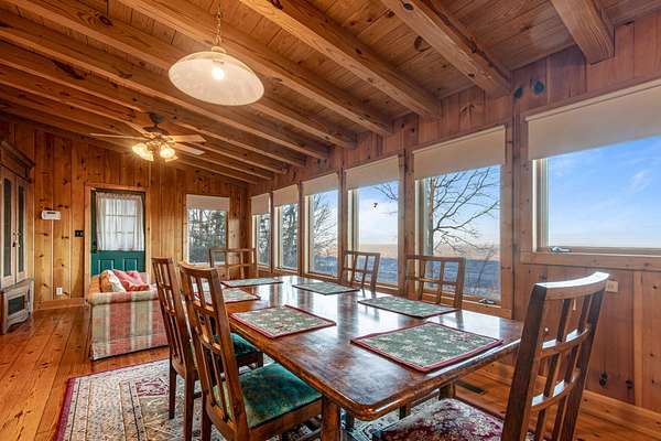 Inside, the heart of the home is the inviting living room, centered around a classic brick wood-burning fireplace and highlighted by soaring wood-beamed ceilings. A sun-filled sunroom with a wall of windows overlooks the mountains and valley below, offering a peaceful space to relax surrounded by nature. The spacious kitchen connects easily to the main living area and is paired with a well-appointed laundry room featuring a sink and built-in shelving. A main-level primary suite with high ceilings sits just off the living space, providing convenience and comfort, while additional bedrooms and attic storage allow room to grow, host guests, or store seasonal items.