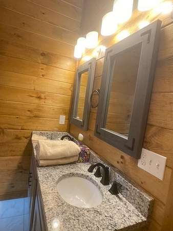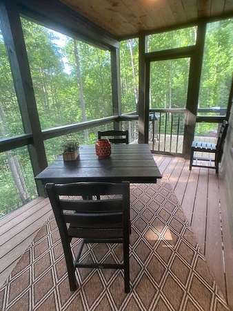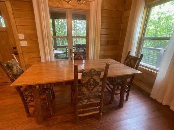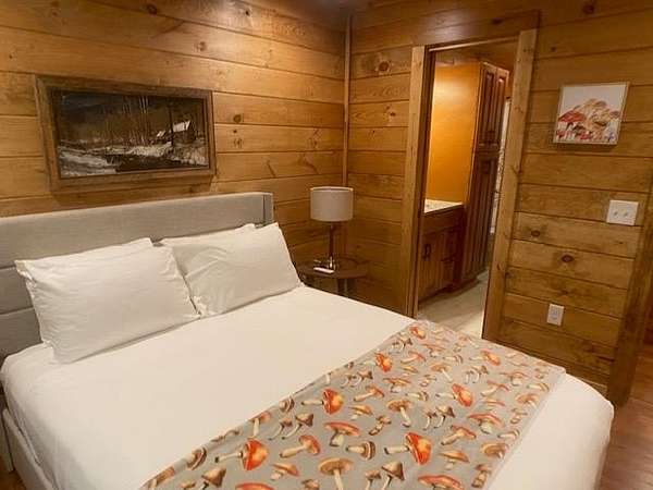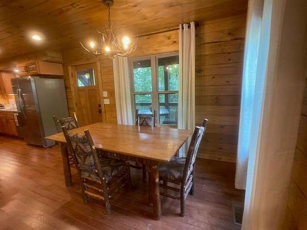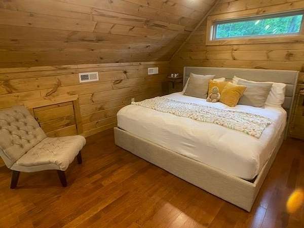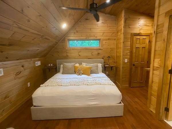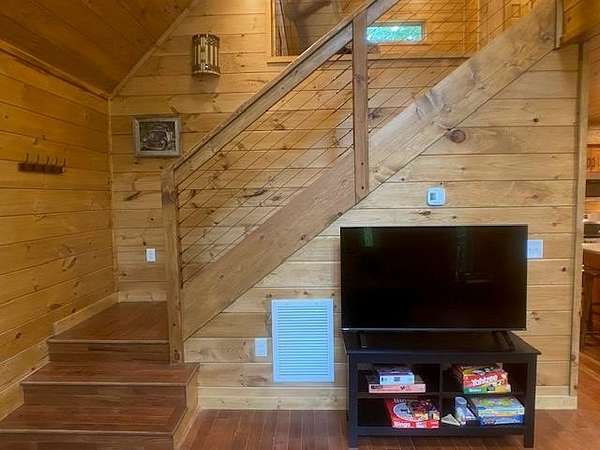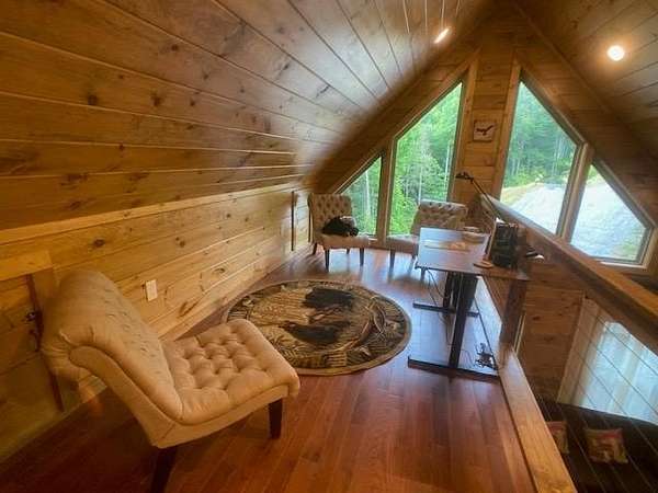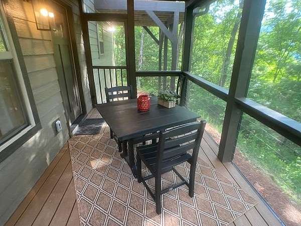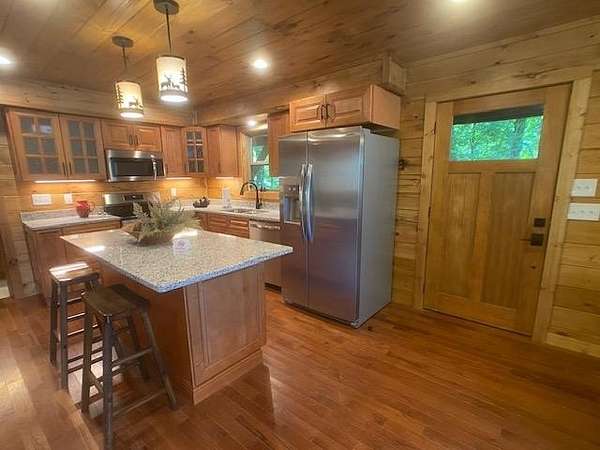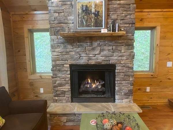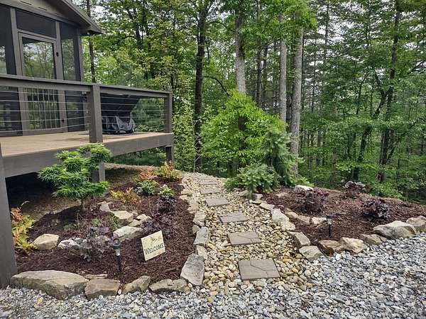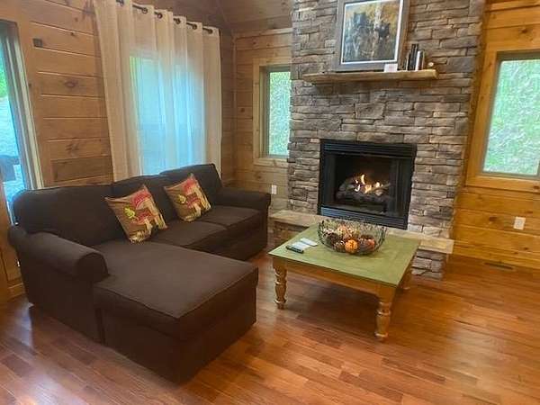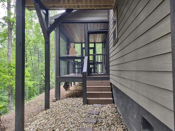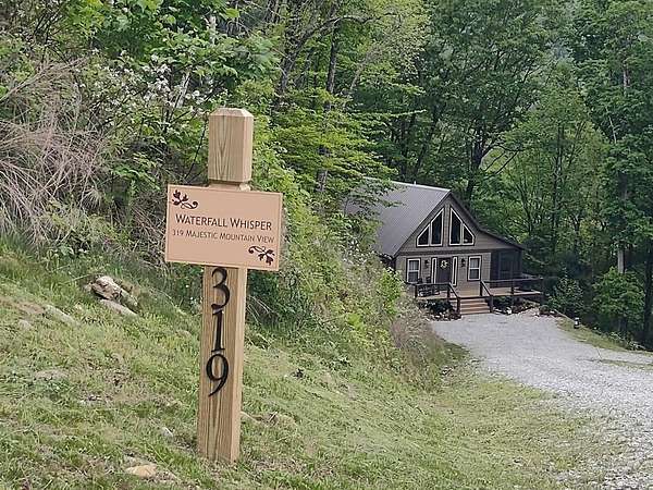 Located in Bartlett Glen Cove in Bryson City, NC, this charming two-bedroom, two-bath cabin is nestled in the woods and within walking distance to a nearby waterfall. The property will convey a deeded pedestrian easement to the waterfall. The home features a spacious open-concept living, dining, and kitchen area highlighted by a stone fireplace with propane gas insert. The kitchen is appointed with stainless steel appliances and granite countertops, complemented by hardwood flooring and tile baths throughout. The primary bath offers a large custom walk-in tile shower with dual shower heads. An open loft on the second level includes a king bed, seating area, coffee nook, and access to a private outdoor balcony. Outdoor living spaces include a screened side porch and an uncovered front deck. Additional features include Louisiana-Pacific SmartSide siding, community amenities such as walking trails, picnic area, historic barn, and Sky Box for homeowners' use. The property is currently operating as a vacation rental on VRBO and Airbnb under the name "Waterfall Whisper." All-wheel drive is required. Owners are NC-licensed REALTORS.