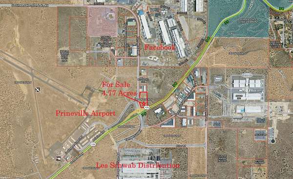 This is a 4.77 acre parcel that is on the corner of Hwy 126 and Tom McCall Rd on top of the grade in Prineville with excellent frontage and exposure. Located in an area that is rapidly growing for industrial/business use. Property is across the road to the east from the Prineville Airport complex and close to other businesses and data centers and a newly built restaurant and fuel station. Across Hwy 126 also has a variety of businesses. The Prineville Freight Depot is 5.5 miles away and the Redmond Airport approx 16 miles. The property is flat and is zoned IP (industrial park) providing a wide range of options for use. Water, sewer, and natural gas are available and run down the east boundary line of the property. Property is located in the Enterprise Zone. Additional maps and zoning information is available.