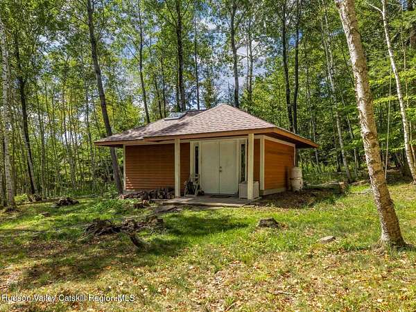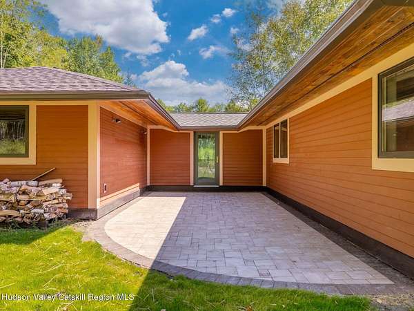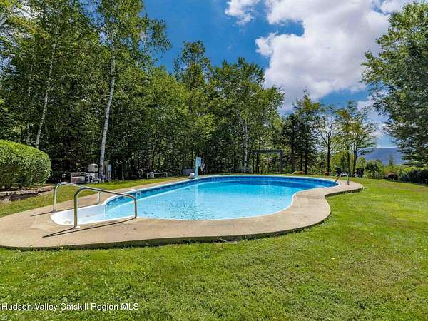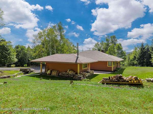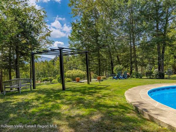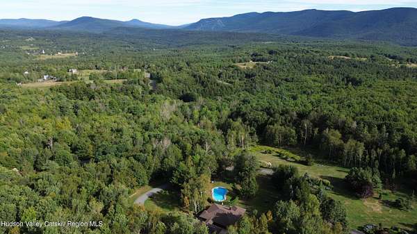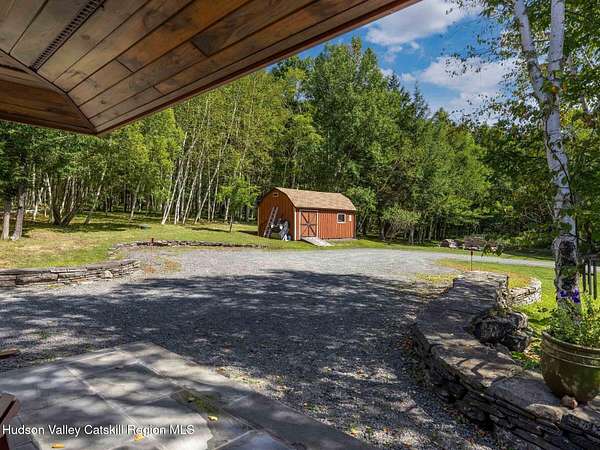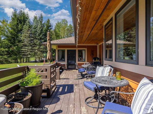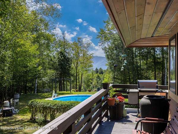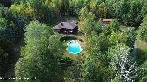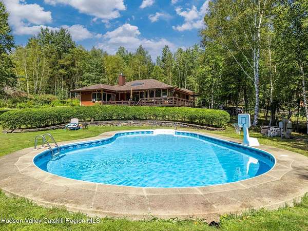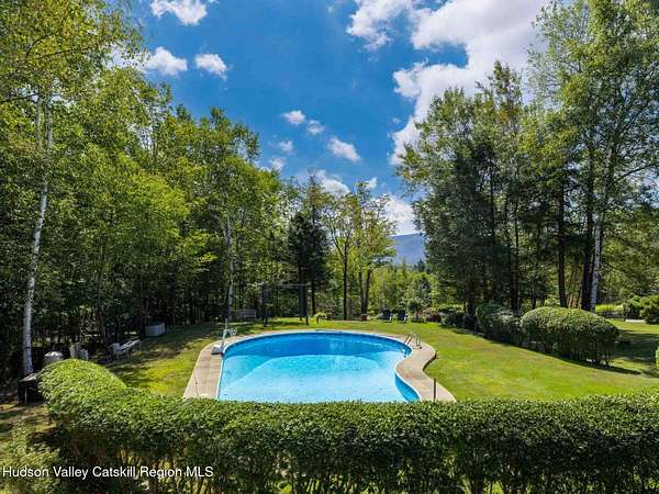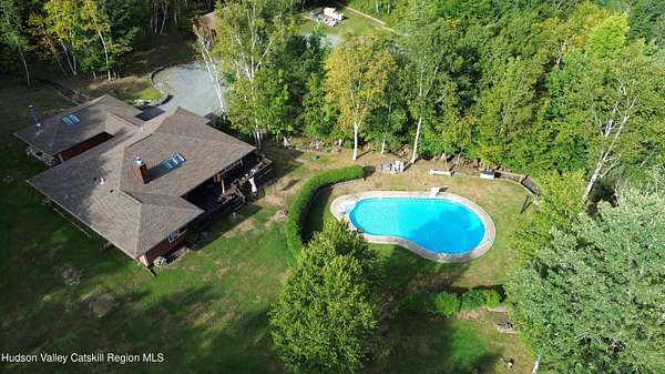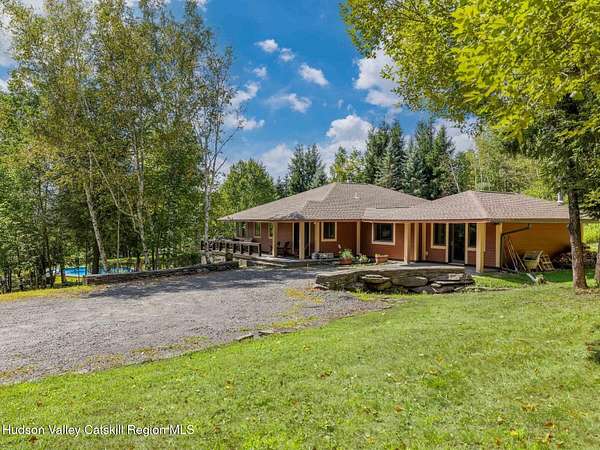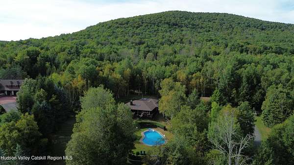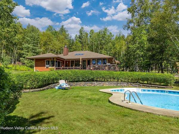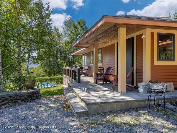 Zen-Inspired Private Retreat with Heated Pool on 7+ Acres, Plus Additional 5-Acre Building Lot on Brittany Hill Road Privately set on over 7 acres across two parcels (SBL# 110.00-6-87 & 110.00-6-86), this stunning cedar contemporary offers a rare blend of tranquility, space, and modern comfort-all just 12 minutes from both Hunter and Windham ski slopes. Tucked away on a cul-de-sac, the property feels like a retreat with its lush lawn, picturesque white birch trees, stone walls, seasonal stream, and breathtaking mountain and ski slope views. The outdoor spaces are designed for enjoyment and entertaining, featuring expansive decks, stone patios, a wrap-around porch, and a heated in-ground pool. The setting is so spectacular that it once hosted a wedding. Inside, the home's great room welcomes with a vaulted pine ceiling and a wood-burning stove, creating a warm and inviting atmosphere. Custom cherry wood and Mexican tile floors flow throughout the main living spaces, while the recently renovated kitchen boasts new cabinets, stone countertops, and updated stainless steel appliances. A seamless connection from the dining room to the covered porch provides effortless indoor-outdoor living. The primary suite offers a private retreat with French doors opening to a covered porch and a stone path leading to the pool. The en-suite bath and serene outdoor access make it a perfect place to unwind. Additional living space includes a family room with vaulted ceilings, Brazilian cherry floors, and a second wood-burning stove. This flexible room, complete with its own entrance, can serve as a fourth bedroom, office, or studio. Recent improvements include brand-new roofs on both the home and outbuilding, plus new skylights, all completed within the past month. There is a new washer/dryer (dual functioning unit) The outbuilding, formerly a yoga studio/gym, is currently used for storage but offers endless possibilities for an artist's studio, workshop, or creative space. A matching cedar-sided shed adds additional storage with style. The property's outdoor lifestyle is unparalleled, with multiple patios and porches and outdoor fire-pit designed for gathering, entertaining, or quiet reflection. The heated in-ground pool provides summer fun with sweeping mountain views, while wildlife roams the grounds, enhancing the sense of a private country escape. The total acreage includes a separate 5-acre building lot with road frontage on Brittany Hill Road. Buyers can keep the land intact for privacy or sell off the additional lot to offset investment. Just 2.5 hours from NYC, this hidden getaway offers easy access to skiing, hiking, fishing, golfing, and more. It's a true four-season retreat where adventure and relaxation meet. A 3D Walkthrough Tour is available in the digital Lookbook or by request from the listing agent.