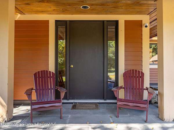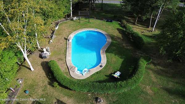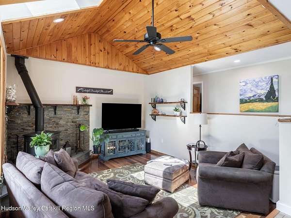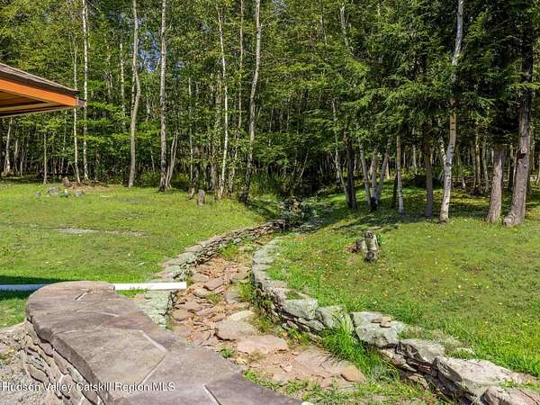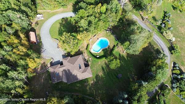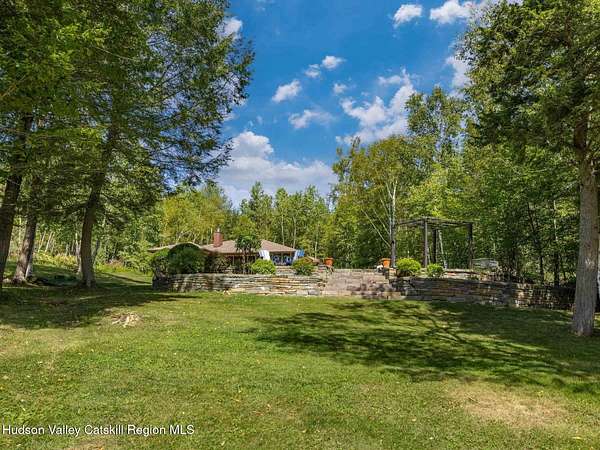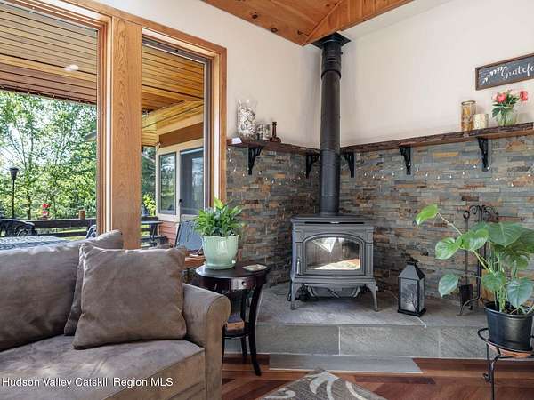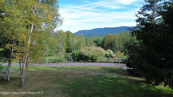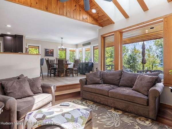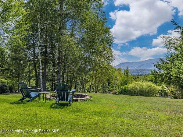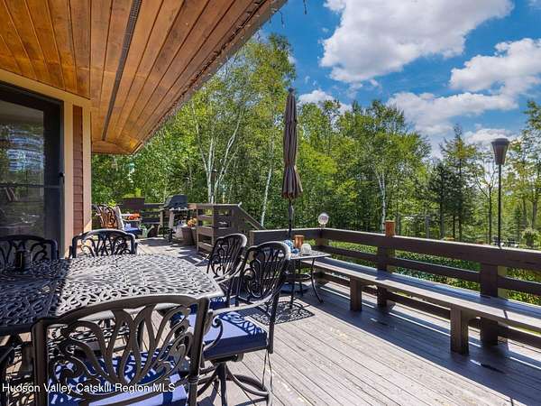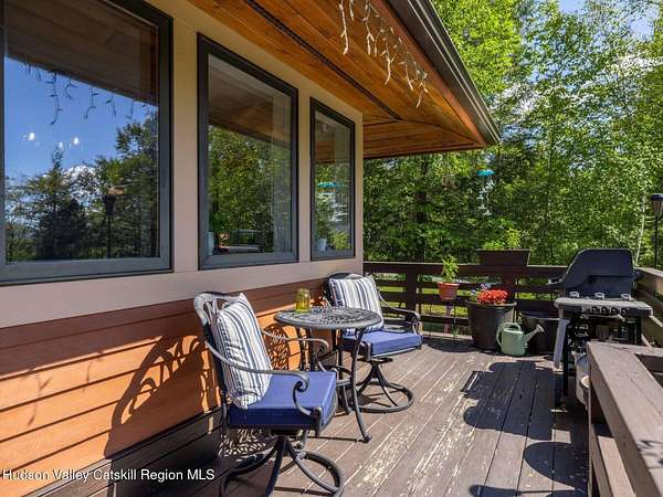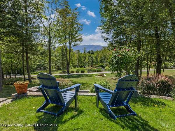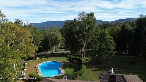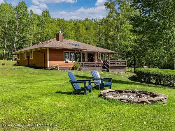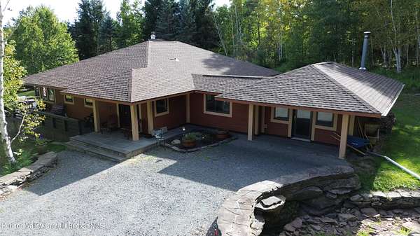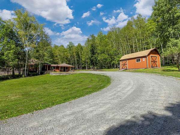 Zen-Inspired Private Retreat with Heated Pool on 7+ Acres, Plus Additional 5-Acre Building Lot on Brittany Hill Road Privately set on over 7 acres across two parcels (SBL# 110.00-6-87 & 110.00-6-86), this stunning cedar contemporary offers a rare blend of tranquility, space, and modern comfort-all just 12 minutes from both Hunter and Windham ski slopes. Tucked away on a cul-de-sac, the property feels like a retreat with its lush lawn, picturesque white birch trees, stone walls, seasonal stream, and breathtaking mountain and ski slope views. The outdoor spaces are designed for enjoyment and entertaining, featuring expansive decks, stone patios, a wrap-around porch, and a heated in-ground pool. The setting is so spectacular that it once hosted a wedding. Inside, the home's great room welcomes with a vaulted pine ceiling and a wood-burning stove, creating a warm and inviting atmosphere. Custom cherry wood and Mexican tile floors flow throughout the main living spaces, while the recently renovated kitchen boasts new cabinets, stone countertops, and updated stainless steel appliances. A seamless connection from the dining room to the covered porch provides effortless indoor-outdoor living. The primary suite offers a private retreat with French doors opening to a covered porch and a stone path leading to the pool. The en-suite bath and serene outdoor access make it a perfect place to unwind. Additional living space includes a family room with vaulted ceilings, Brazilian cherry floors, and a second wood-burning stove. This flexible room, complete with its own entrance, can serve as a fourth bedroom, office, or studio. Recent improvements include brand-new roofs on both the home and outbuilding, plus new skylights, all completed within the past month. There is a new washer/dryer (dual functioning unit) The outbuilding, formerly a yoga studio/gym, is currently used for storage but offers endless possibilities for an artist's studio, workshop, or creative space. A matching cedar-sided shed adds additional storage with style. The property's outdoor lifestyle is unparalleled, with multiple patios and porches and outdoor fire-pit designed for gathering, entertaining, or quiet reflection. The heated in-ground pool provides summer fun with sweeping mountain views, while wildlife roams the grounds, enhancing the sense of a private country escape. The total acreage includes a separate 5-acre building lot with road frontage on Brittany Hill Road. Buyers can keep the land intact for privacy or sell off the additional lot to offset investment. Just 2.5 hours from NYC, this hidden getaway offers easy access to skiing, hiking, fishing, golfing, and more. It's a true four-season retreat where adventure and relaxation meet. A 3D Walkthrough Tour is available in the digital Lookbook or by request from the listing agent.