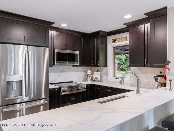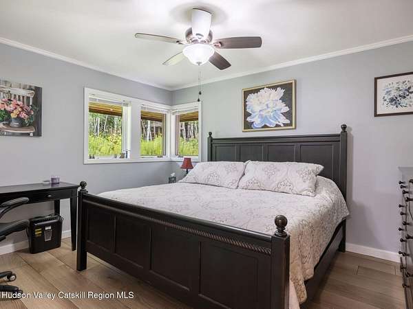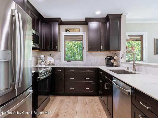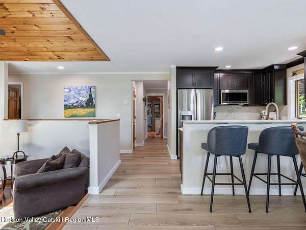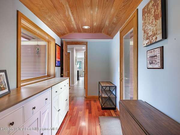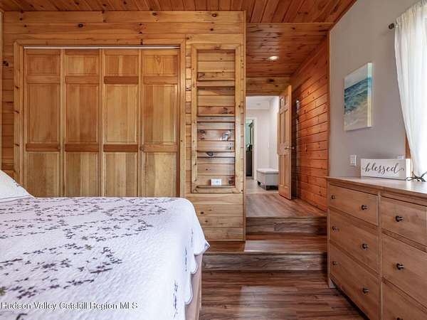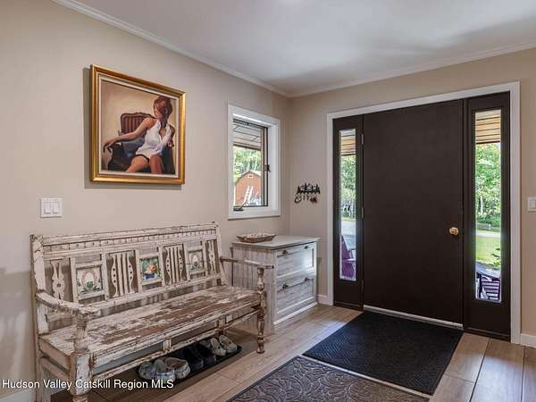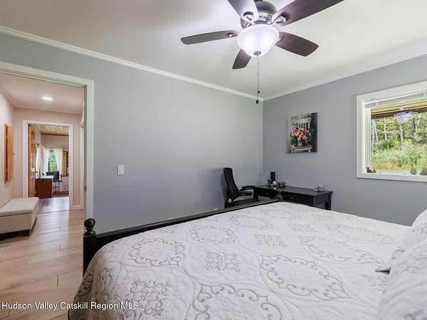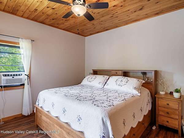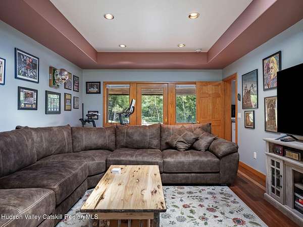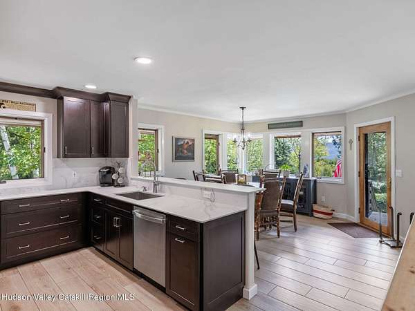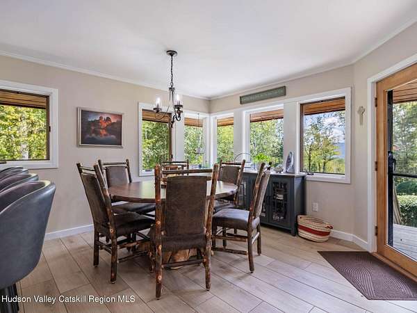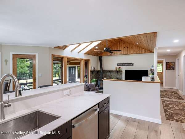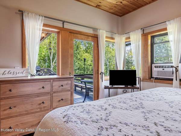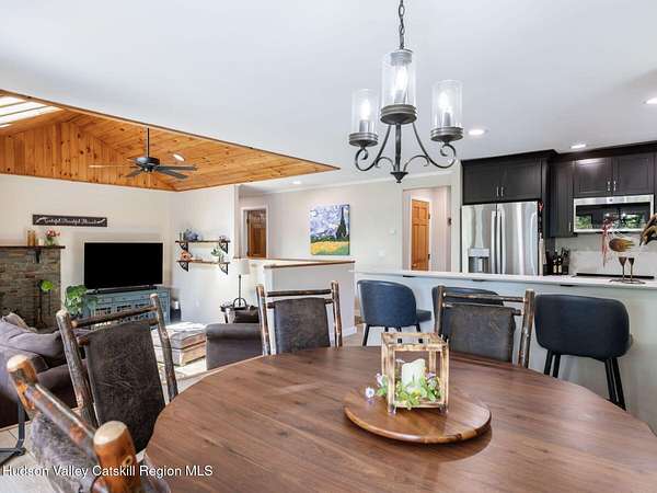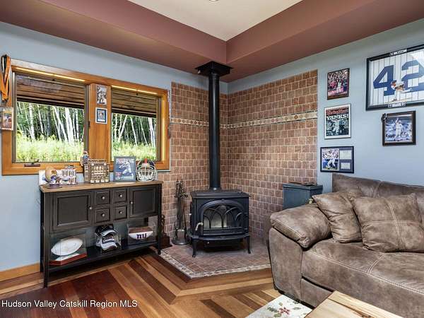 Zen-Inspired Private Retreat with Heated Pool on 7+ Acres, Plus Additional 5-Acre Building Lot on Brittany Hill Road Privately set on over 7 acres across two parcels (SBL# 110.00-6-87 & 110.00-6-86), this stunning cedar contemporary offers a rare blend of tranquility, space, and modern comfort-all just 12 minutes from both Hunter and Windham ski slopes. Tucked away on a cul-de-sac, the property feels like a retreat with its lush lawn, picturesque white birch trees, stone walls, seasonal stream, and breathtaking mountain and ski slope views. The outdoor spaces are designed for enjoyment and entertaining, featuring expansive decks, stone patios, a wrap-around porch, and a heated in-ground pool. The setting is so spectacular that it once hosted a wedding. Inside, the home's great room welcomes with a vaulted pine ceiling and a wood-burning stove, creating a warm and inviting atmosphere. Custom cherry wood and Mexican tile floors flow throughout the main living spaces, while the recently renovated kitchen boasts new cabinets, stone countertops, and updated stainless steel appliances. A seamless connection from the dining room to the covered porch provides effortless indoor-outdoor living. The primary suite offers a private retreat with French doors opening to a covered porch and a stone path leading to the pool. The en-suite bath and serene outdoor access make it a perfect place to unwind. Additional living space includes a family room with vaulted ceilings, Brazilian cherry floors, and a second wood-burning stove. This flexible room, complete with its own entrance, can serve as a fourth bedroom, office, or studio. Recent improvements include brand-new roofs on both the home and outbuilding, plus new skylights, all completed within the past month. There is a new washer/dryer (dual functioning unit) The outbuilding, formerly a yoga studio/gym, is currently used for storage but offers endless possibilities for an artist's studio, workshop, or creative space. A matching cedar-sided shed adds additional storage with style. The property's outdoor lifestyle is unparalleled, with multiple patios and porches and outdoor fire-pit designed for gathering, entertaining, or quiet reflection. The heated in-ground pool provides summer fun with sweeping mountain views, while wildlife roams the grounds, enhancing the sense of a private country escape. The total acreage includes a separate 5-acre building lot with road frontage on Brittany Hill Road. Buyers can keep the land intact for privacy or sell off the additional lot to offset investment. Just 2.5 hours from NYC, this hidden getaway offers easy access to skiing, hiking, fishing, golfing, and more. It's a true four-season retreat where adventure and relaxation meet. A 3D Walkthrough Tour is available in the digital Lookbook or by request from the listing agent.