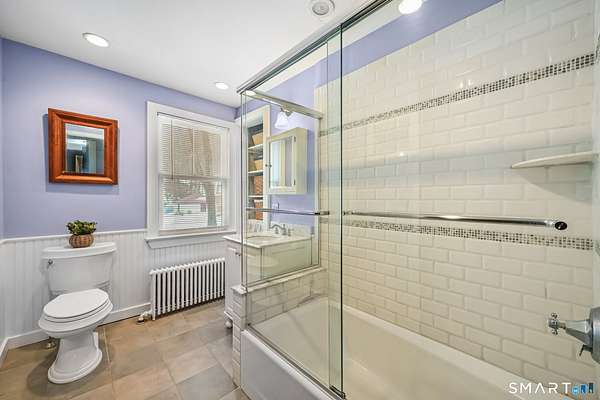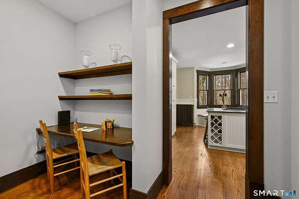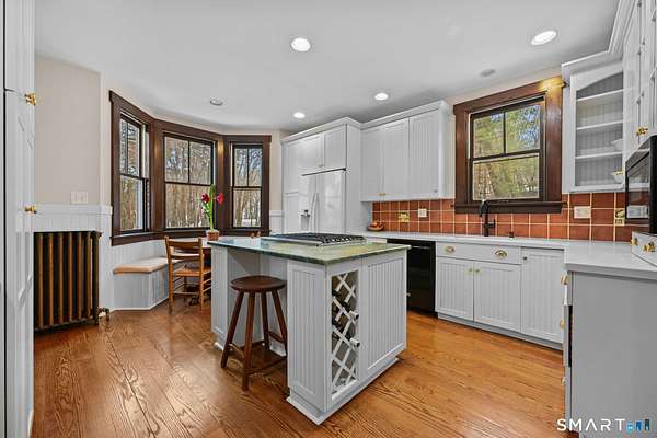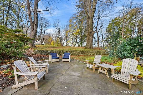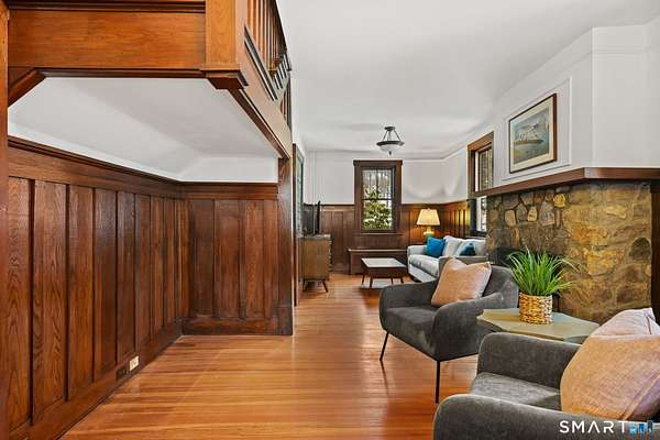 Perched on a beautifully terraced 1.51-acre property in Wilton, the historic Louis Warncke House (circa 1909) offers a rare blend of architectural character, warmth, and modern livability. This distinctive residence showcases exceptional craftsmanship throughout, including rich original wood paneling, coffered ceilings, hardwood floors, and striking millwork rarely found in homes today. The main living spaces are both elegant and inviting, anchored by a dramatic stone fireplace and surrounded by oversized windows that fill the home with natural light and scenic views of the surrounding landscape. A gracious dining room with bay windows creates the perfect setting for entertaining, while the thoughtfully updated kitchen features custom cabinetry, a center island with gas cooktop, stone counters, and a charming breakfast nook framed by windows. The home offers four bedrooms plus multiple flexible living areas ideal for today's lifestyle, including a private reading room, dedicated office space, and expansive upper-level bonus rooms that can easily function as playroom, studio, or guest retreat. Several bedrooms feature beautiful original floors and large windows that overlook the peaceful wooded setting. Recent improvements include updated windows, roof, boiler, and mechanical systems, blending modern comfort with the home's historic integrity. Two full bathrooms feature tasteful updates, including a double vanity bath and glass-enclosed shower.