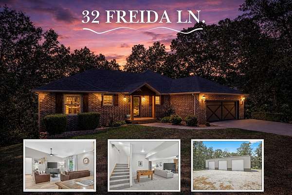 Loan is assumable at 5.875% (for those who qualify). Magnificent walkout basement home located at the end of a culdesac that's over 4000 sqft situated on a stunning 5.2 acres in Nixa Schools! Within a 10 minute drive to Nixa, 5 minutes from James River, restaurants, Parks, bike trails, and a disc golf course! This home is a dream for those that love the outdoors! The massive 5+ acres is abundant with deer and turkey for hunters, features a tree stand, paths, and driving access to your own campgrounds with a firepit. The newly built enormous 40x60 shop is absolutely perfect for storing your toys and/or working on projects because it offers electricity, heating and cooling, concrete floors, and 3 very tall garage doors! Inside the home, you'll find the best floorplan that's beautifully functional for lots of occupants, guests, and/or work from home environments. Marvel at the vaulted ceilings, hardwoods, 2 living areas, screened in deck and covered back porch. The kitchen features stainless appliances, Callacatta Roma quartz countertops, walk in pantry, and breakfast bar. The large basement area has tall ceilings, more bedrooms, a wet bar, and offers great natural light. What's not to love about 32 Freida Ln?!