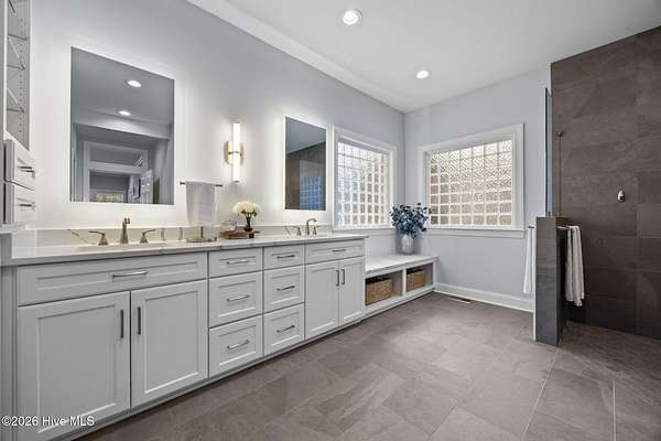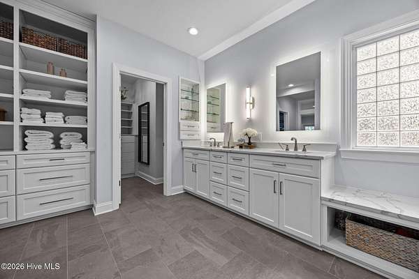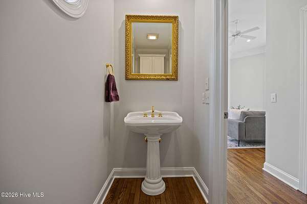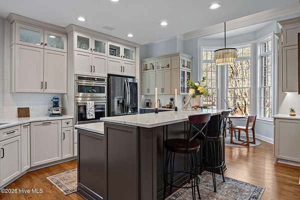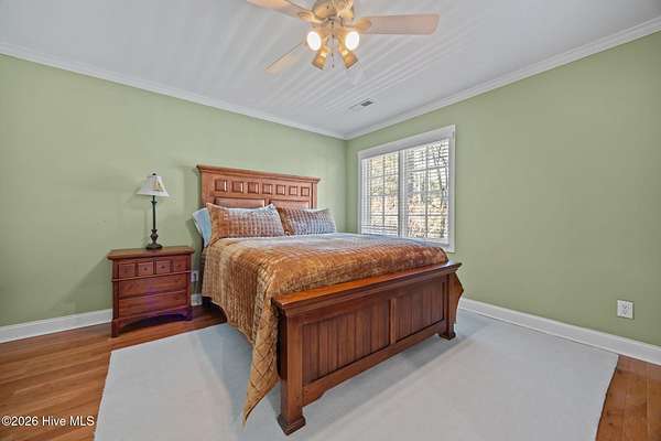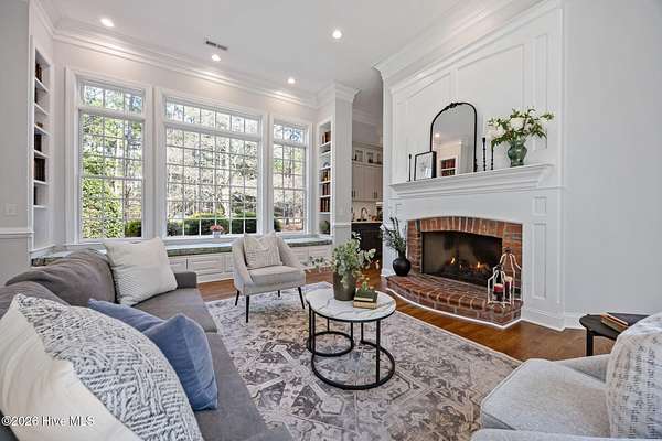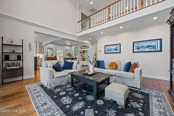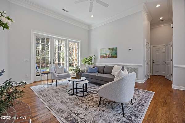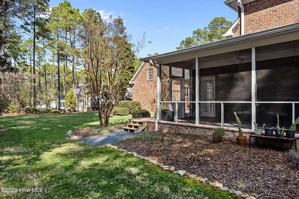 This gorgeous golf front home sits on two lots in a peaceful cul-de-sac, backing up to a large, wooded area for added privacy and natural beauty. Step into the natural light-filled entry that welcomes you into this lovely home featuring beautifully refinished hardwood flooring throughout. Renovated in 2022, the interior features high-end finishes. The main level is open and bright, offering an abundance of living space. The living room and Carolina room are light and airy spaces adding to the elegance of the layout. The heart of the home is the beautiful chef's kitchen with Eudy custom cabinets, in-cabinet dimmer lighting, GE Cafe appliances, and a sleek induction cooktop, ideal for cooking and entertaining. The main level primary suite includes custom Eudy cabinetry, his-and-her walk-in closets, a curbless walk-in shower and private access to the screened porch and back patio. Finishing off the main level is a second bedroom with full bath. Upstairs, you'll find three additional bedrooms, a full bath, and a versatile bonus room, perfect for a hobby room, or guest space. Step out the back door to find the first tee of the three-hole Challenge Course, making this property perfect for golf enthusiasts. The outdoor living space is equally as nice with a large brick patio and wonderful fire pit area ideal for relaxing with a drink or making smores! This home offers a blend of luxury, space, and golf course living in a tranquil setting. Schedule a private showing today!