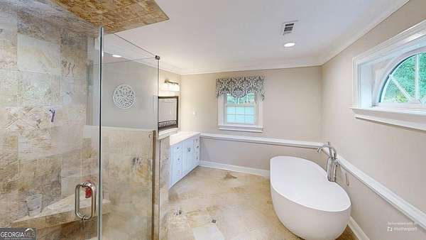 - Central Vacuum, Double Vanity, In-Law Floorplan, Master On Main Level, Separate Shower, Soaking Tub, Tile Bath, Tray Ceiling(s), Walk-In Closet(s)