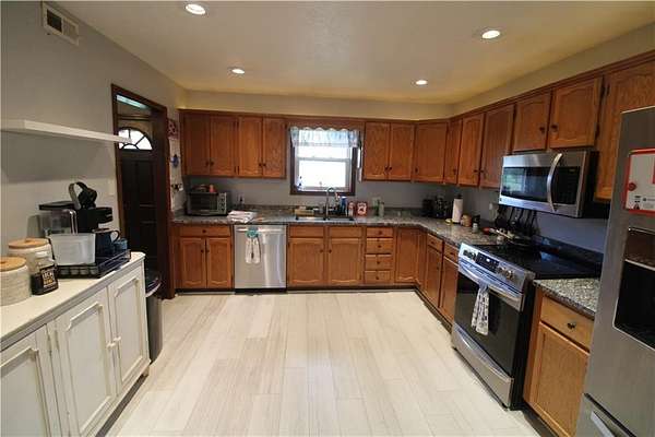 Step outside the city limits and into space, comfort, and a setting you'll love coming home to. This beautifully maintained raised ranch sits on 2.63 acres MOL offers the perfect mix of open living and peaceful surroundings. Inside, you'll find a spacious layout with large rooms, an open floor plan, and a kitchen designed to impress-featuring granite countertops and plenty of room to gather. With 3 bedrooms and 3 full bathrooms, 2 car attached garage, there's space for everyone, plus the convenience of main floor laundry. The finished basement adds even more versatility with a full bathroom and a built-in storm shelter for peace of mind. Enjoy quiet mornings or evening sunsets from the back deck, or relax on the patio while taking in the wide-open views and wildlife just beyond your backyard. Schedule your showing today!