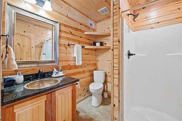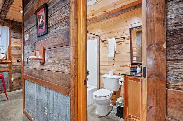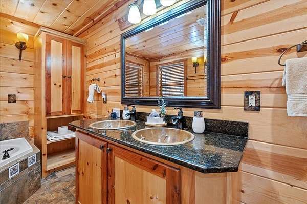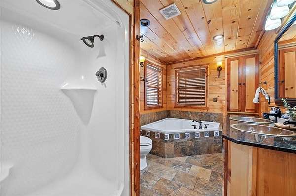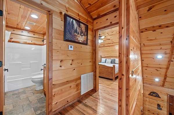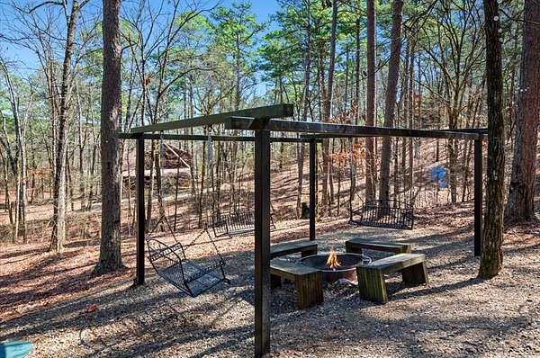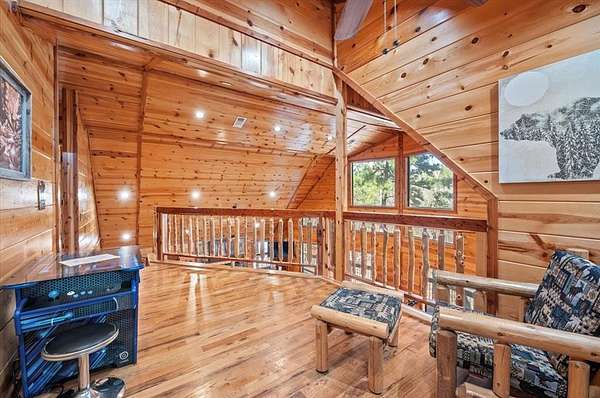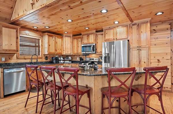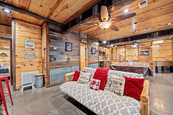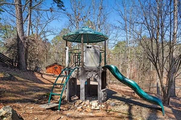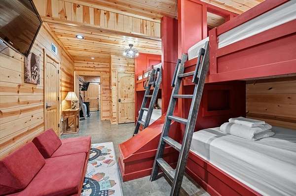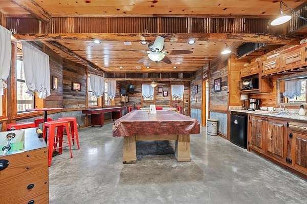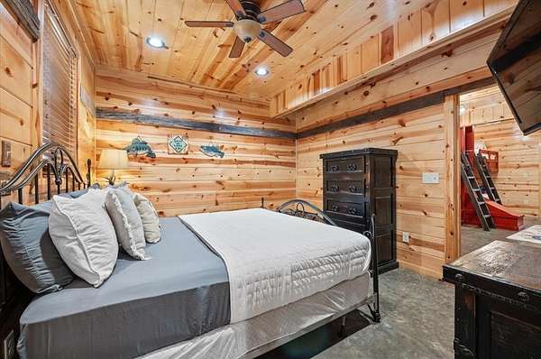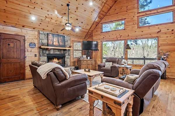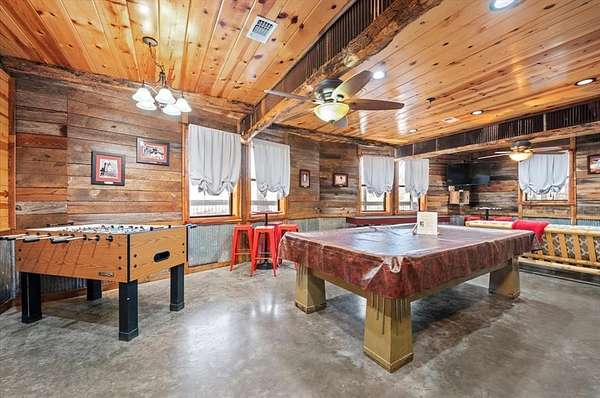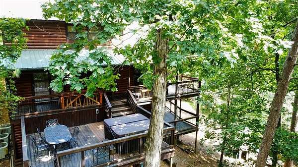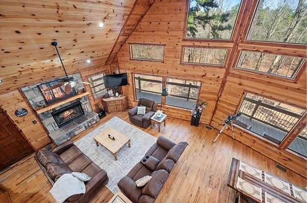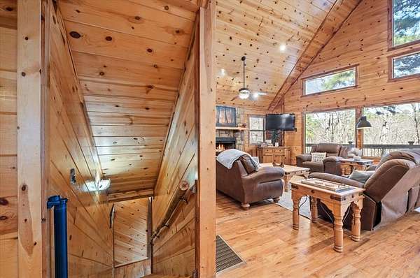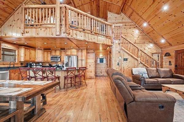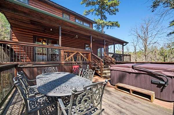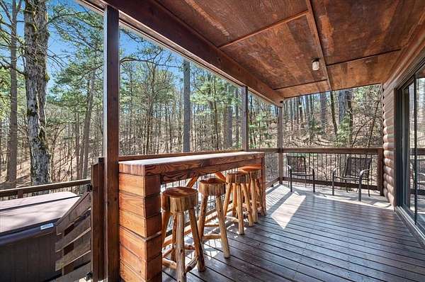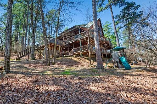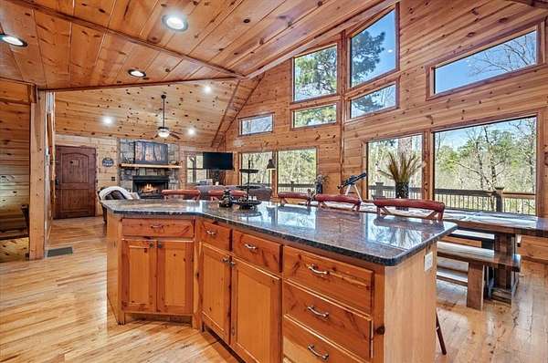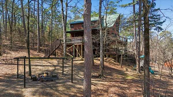 Motivated seller-bring your offer! Bear's Eye View is a beautifully updated 5-bed, 5-bath cabin located near Beavers Bend State Park, Broken Bow Lake, and the Mountain Fork River. This fully furnished retreat is packed with upgrades and turnkey for its next owner or investor. Inside, a dramatic wall of windows spanning the second to third floor fills the open living area with natural light and tranquil forest views. Guests can gather around the wood-burning fireplace or enjoy stargazing through the telescope. The kitchen features stainless steel appliances, an island with seating for five, and convenient access to the laundry area. Major 2025 improvements include three new HVAC systems, a tankless water heater, hot tub, microwave, couch, and a re-felted pool table. Over the past two years the cabin has seen extensive enhancements such as a custom bunk room, new dishwasher, asphalt driveway, two-car garage, outdoor firepit, washer and dryer, mattresses, and a dining table (negotiable). The refrigerator, additional living room furniture, and fresh deck stain were added in 2022-showing consistent attention to maintenance and quality. The main-level King suite offers a therapeutic bed, private deck access, and an ensuite with a jetted tub and walk-in shower. Upstairs, the loft provides a gaming table, queen sleeper sofa, lounge seating with treetop views, and two additional King bedrooms with a shared bath. Downstairs is an entertainer's dream game room featuring pool, shuffleboard, foosball, a TV lounge, and wet bar with mini-fridge and microwave. This level also includes another King bedroom and an incredible custom bunk room with Queen-over-Queen bunks and a built-in slide. Outdoor living shines with multi-level decks, hot tub, bar seating, grill, custom swing benches, firepit, kids' playset, and cornhole, perfect for unforgettable gatherings in the heart of Hochatown. Seller is eager to make a deal!