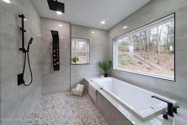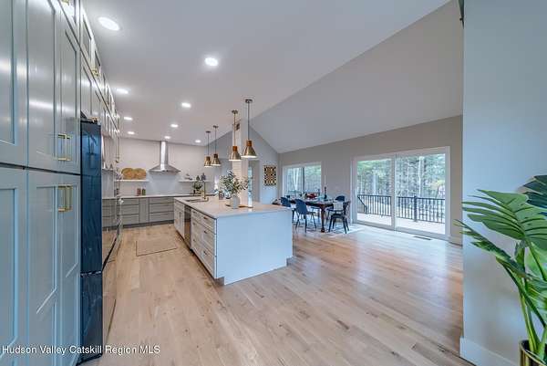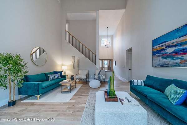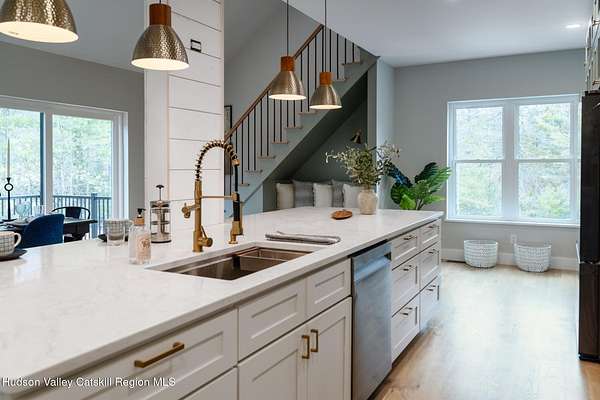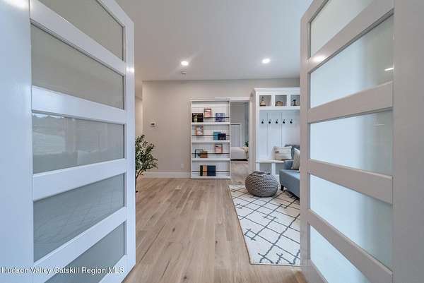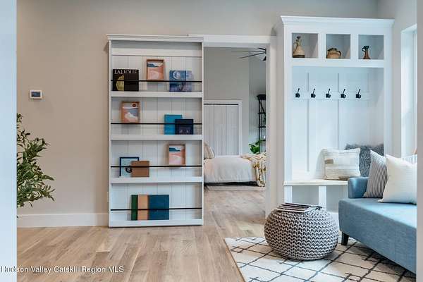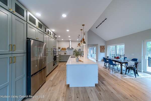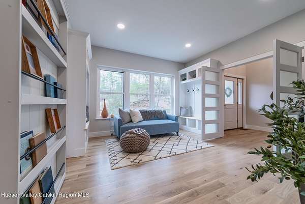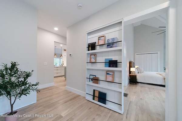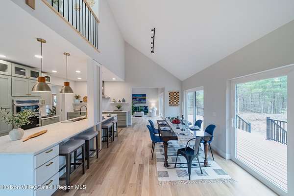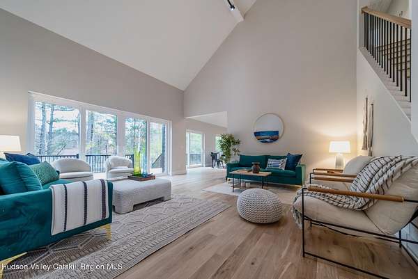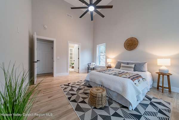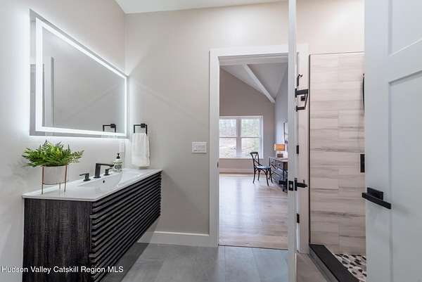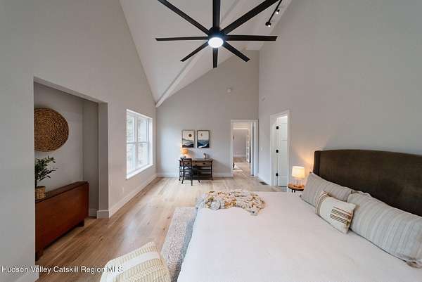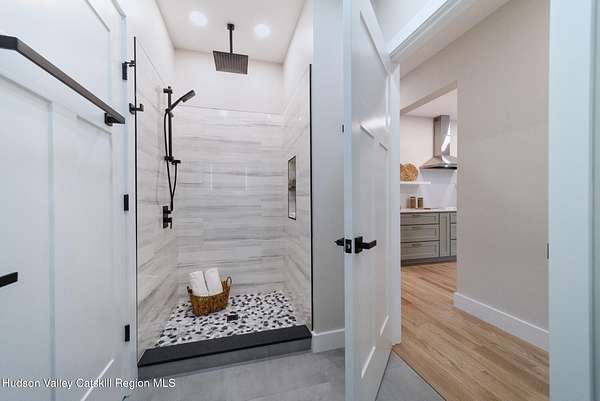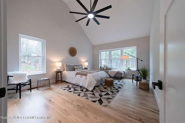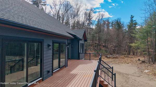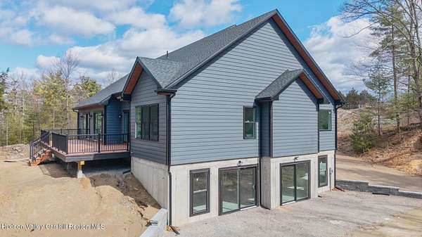Set on six private acres surrounded by mature trees, natural rock outcroppings, and the quiet beauty of the Hudson Valley, this newly constructed 2026 contemporary estate delivers a refined blend of modern design and organic elegance. A striking exterior of Everlast Storm Grey siding paired with warm natural wood accents and expansive windows creates a dramatic first impression while inviting natural light into every corner of the home. Inside, five inch white oak flooring flows seamlessly throughout the main level, guiding you into a sun drenched living room designed for both relaxation and entertaining. The kitchen is a true centerpiece, thoughtfully curated with a generous center island, custom cabinetry, and an intimate reading nook. A concealed pantry complete with wine cooler, shelving, and prep space offers the perfect hidden hub for hosting, while easy access to the expansive deck invites effortless indoor outdoor living with peaceful woodland views. The primary suite offers a tranquil retreat with a spa inspired bath featuring a luxurious wet room designed to restore and recharge. A second main level suite with soaring ceilings and a full bath provides exceptional flexibility for guests or multigenerational living. The morning room enhances daily routines with built in cubbies, lounging space, and an organized transition into the day. Upstairs, two additional bedrooms with oversized closets share a well appointed full bath. Dual staircases add architectural intrigue and lead to unexpected hidden spaces that can serve as reading nooks, creative studios, or private escapes. Custom millwork, designer fixtures, built in shelving, and bespoke doors elevate every detail. A full walkout basement expands the living possibilities, while state of the art geothermal heating and cooling ensures year round comfort with energy efficiency. Ideally positioned in the Hudson Valley, this property offers convenient access to the vibrant energy of Uptown Kingston, explore the historic streets, acclaimed dining, and cultural attractions found Uptown. A short drive to Kingston's Rondout area with it's riverfront activities along the Rondout Creek and the Hudson River is another destination with its eateries, shops and museums. Enjoy touring Hurley's Stone House Historic District or play a round at the prestigious Wiltwyck Golf Club. Outdoor enthusiasts will appreciate nearby access to the scenic Hudson Valley Rail Trail, along with hiking, biking and more! A rare offering that seamlessly blends luxury, privacy, and access to some of the Hudson Valley's most desirable destinations, this home delivers an elevated lifestyle in a truly exceptional setting.